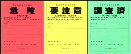 [解説]危険度の判定は、余震などによる建物の崩壊によって引き起こされる人命の危険度と、建物の部分などの落下や転倒によって引き落とされる人命の危険度をそれぞれ別途に判定し、建物の使用の可否等を表示する仕組みである。