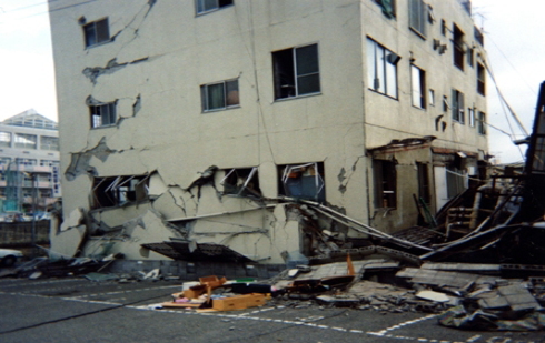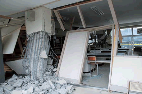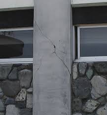 柱あるいは壁の鉄筋が曲り、内部のコンクリートも崩れ落ち、一見して高さ方向の変形が生じている場合である。