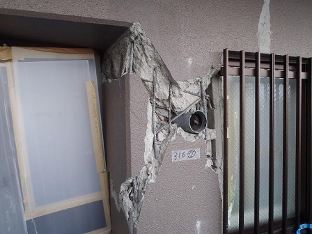 コンクリートを軽く突くとコンクリートが落下し、鉄筋がかなり見えるような破壊が生じ、ひび割れの幅も2ミリを超えている。