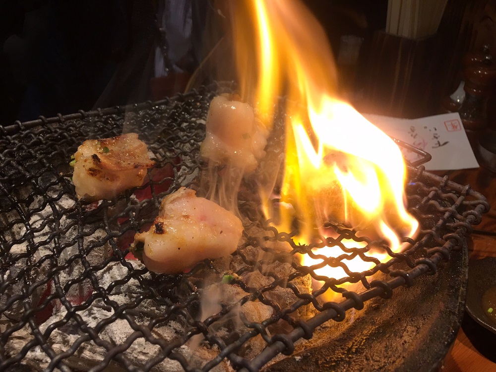 名物のはつもと680円、これもまた脂が多く、氷で火消しをしながら焼き上げます。