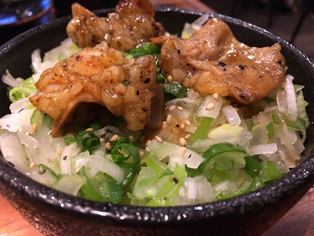 運ばれてきたのは、ご飯の上に大量に刻んだねぎが乗せられた小ぶりなどんぶり、先輩は、おもむろにトロホルモンを焼き上げると、それぞれのたれ皿にトロホルモンを分け入れ、「こうするんだよ!」と、たれごとトロホルモンをねぎめしの上に投入、後はお好みで適当にかき混ぜながら食べるんだよ。うまいぞ!