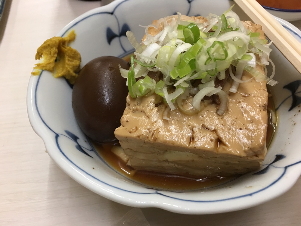 先輩が、瓶ビール、肉豆腐に煮卵付けて、脳天の刺身と小気味よく軽快に注文すると、出てくるのも本当に早い!