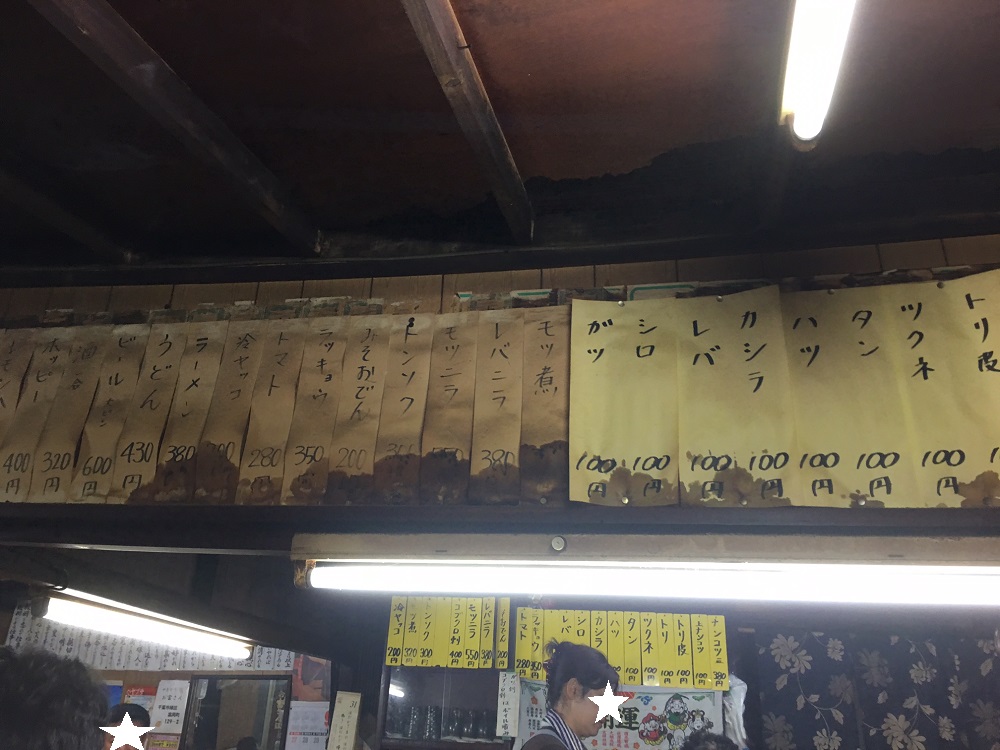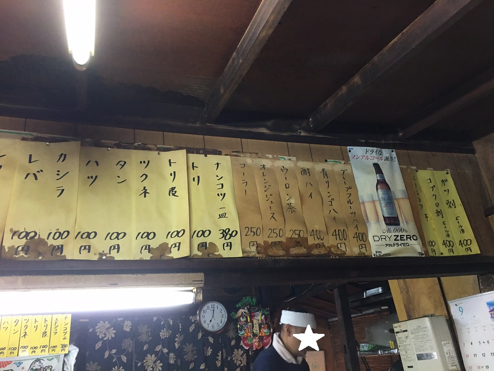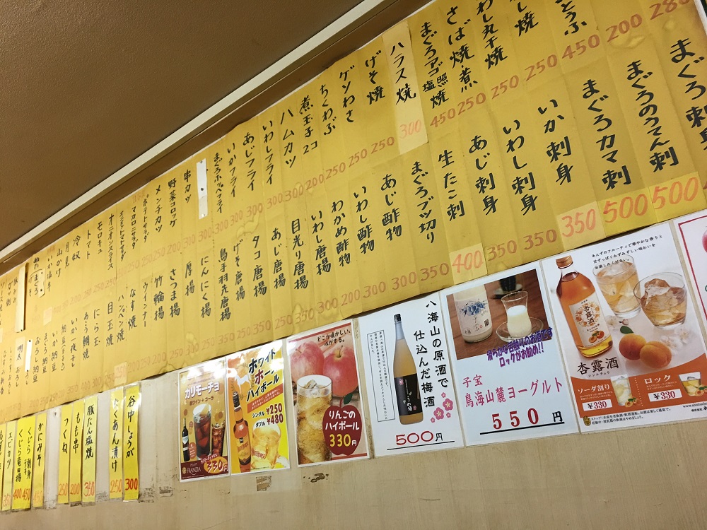 改めて久しぶりの店内を見渡すと、壁に貼られたメニューの多さとお酒の安さにに驚く。 メニューのほとんどが300円台、酎ハイは230円!!