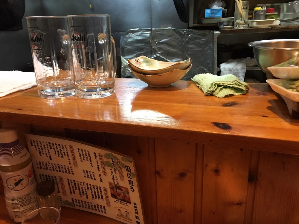 土曜の夕方まだ5時だというのにもう満席! 先輩がお店の方と話してしばらくすると、誰かが出て行ったわけでもないのですが、「どうぞ」と通されました。  もともと狭い店舗なのですが、混んでくると、それでなくとも隣の方との肩が触れ合うほどなのに、さらに詰めてもらって席を確保していただいたのでした。
