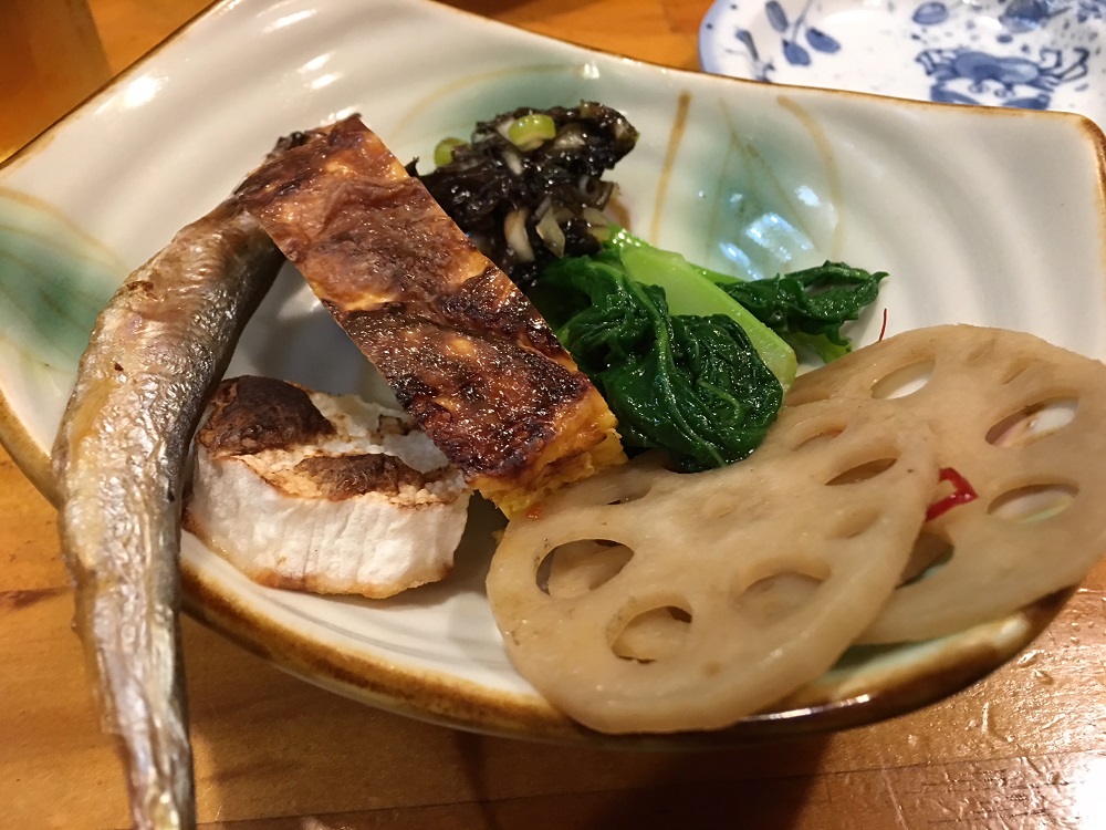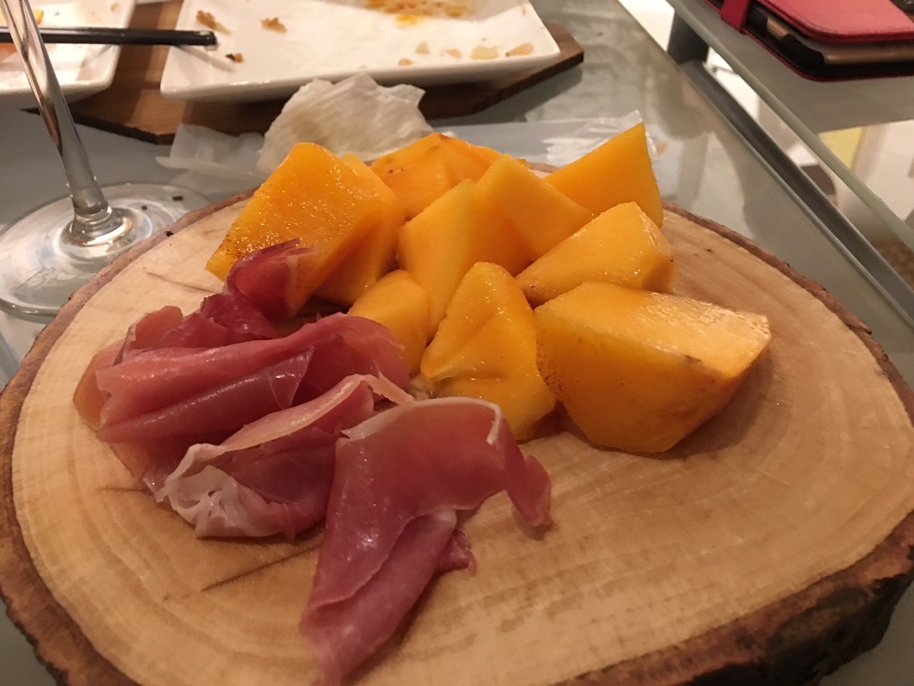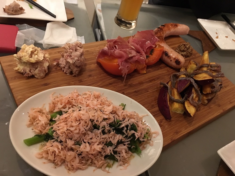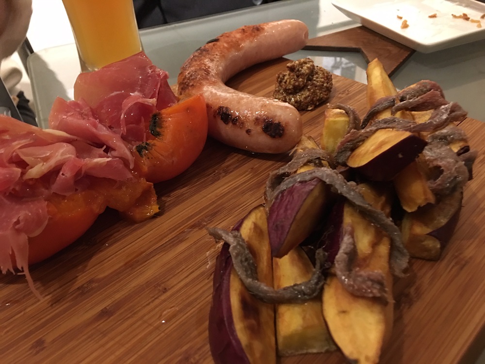 大きなチキンのソーセージ、サツマイモのフライのアンチョビ乗せ、オキアミと青菜の炒め物、熟したカキと生ハム、パンにつけて頂ける2種類のパテ、が大きな木のプレートに載せて運ばれてきました。