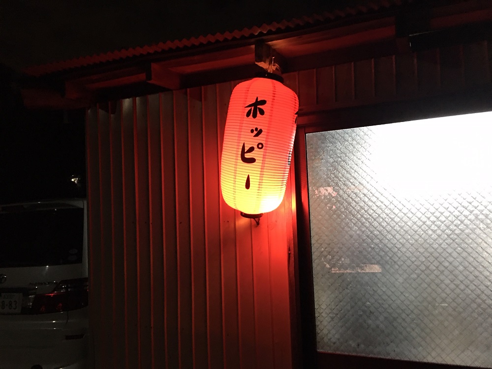 せめて、お店の周りの情景を少しご紹介すると、田園が広がり、周りにお店はありません。夜になると、あたりは真っ暗で、看板もありません。唯一下の写真のようにホッピーの提灯に明かりがついているだけ。  満席で入れないときは、代わりの店は無く、外で席が空くのをじっと待ちます。