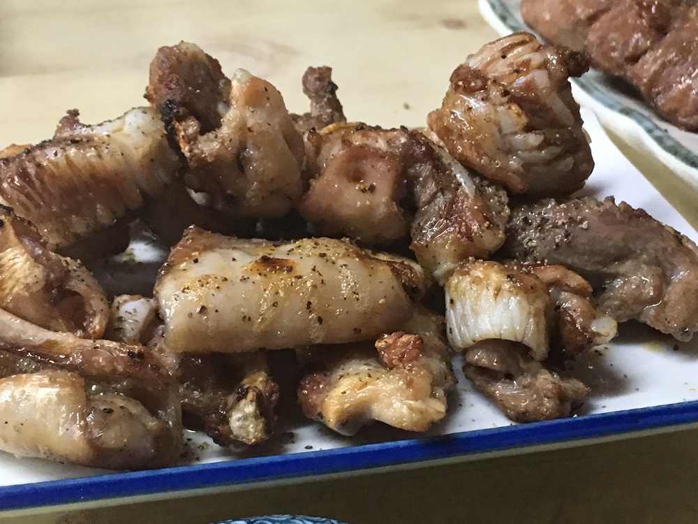 前置きが長くなってしまいました。いよいよです!名物の豚レバー500円、新鮮なので切った角が立っています。焼いて食べてもレバーの臭みは無く「美味しい」レバーのいいとこだけが口の中に広がります。