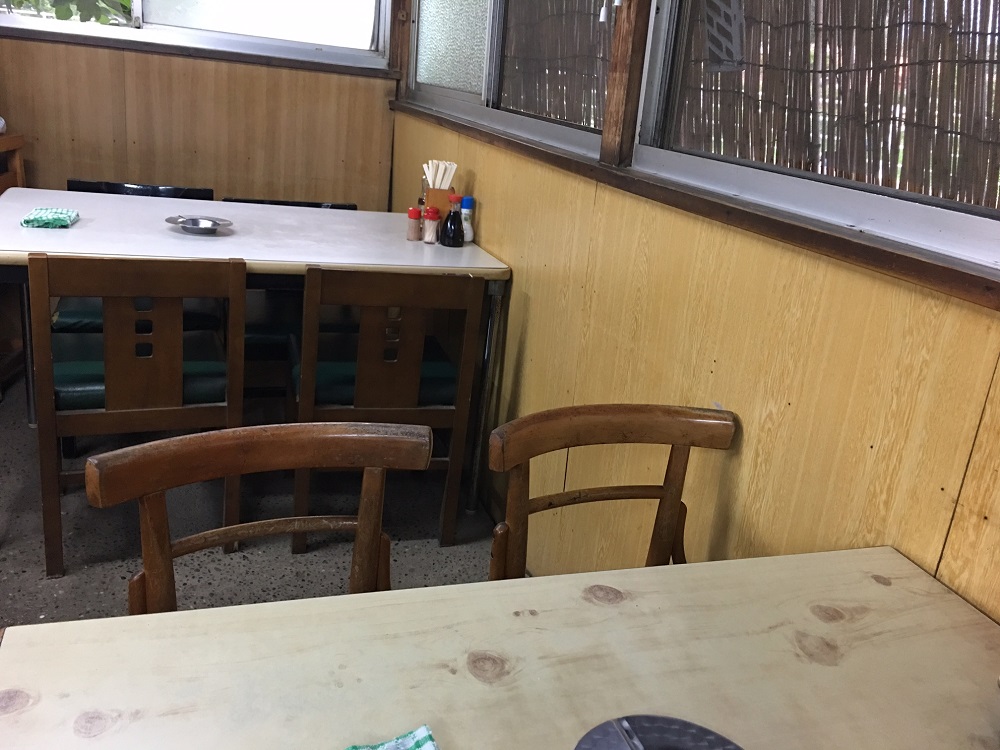 お店の造りは20年前と良くも悪くもほとんど変わっておらず、扇風機が気休めに回ってますが夏は暑く、冬は入り口付近に石油ストーブがありますが上着を着たままが基本です。トイレは店の外に仮設トイレが常設されております。  店の中を見渡すと昭和の田舎の食堂を彷彿させるレトロなテーブルと椅子が置かれております。