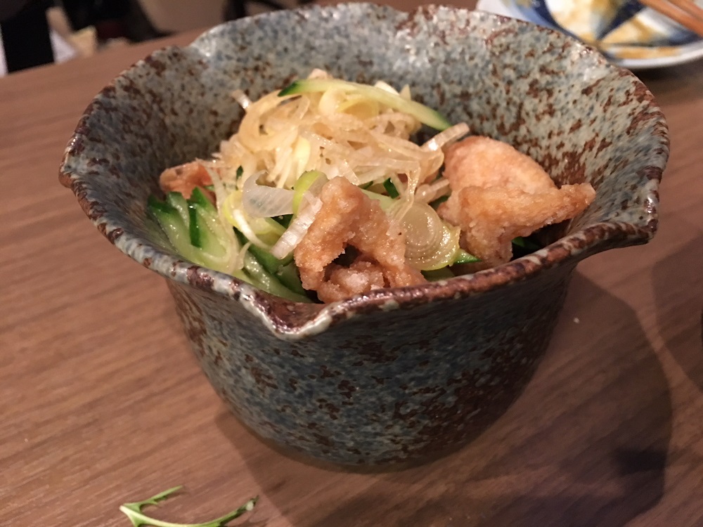 サクサクに揚がった鶏皮とキュウリとポン酢の相性は最高です。