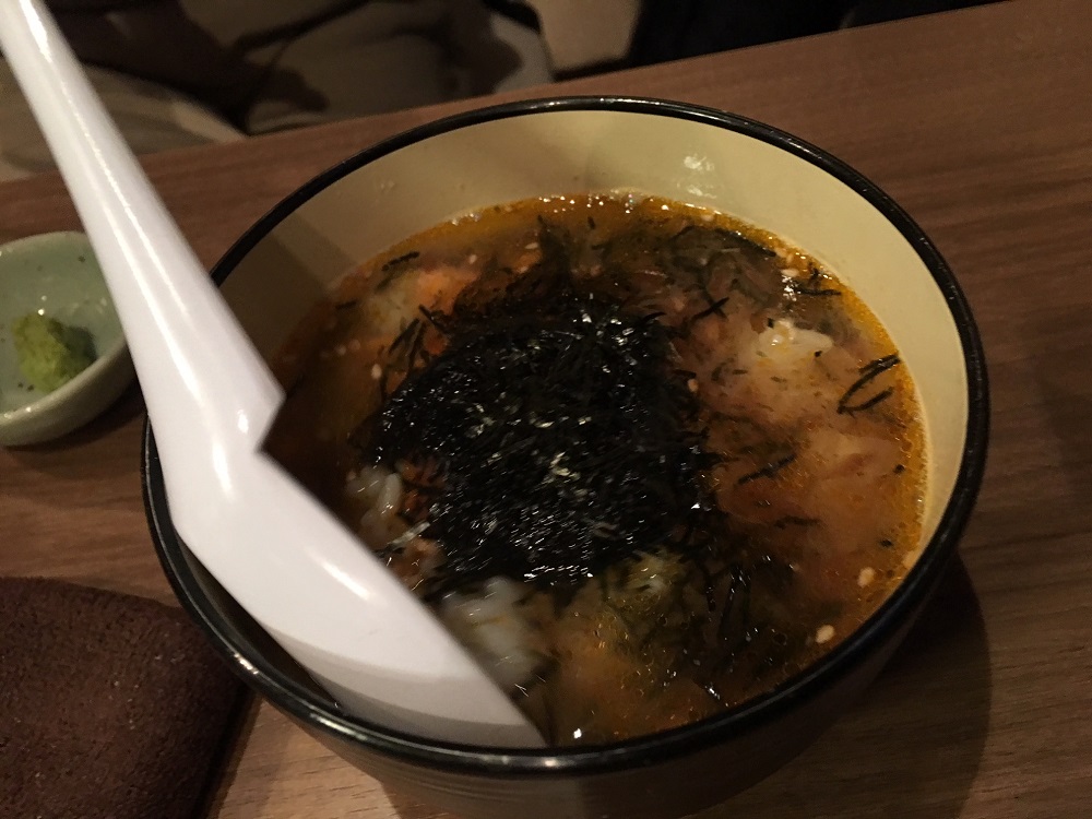 やはり美味い!海苔はかき混ぜると粉々に溶け出し、明太子とお出汁とご飯とがお互いを引き立て合います。