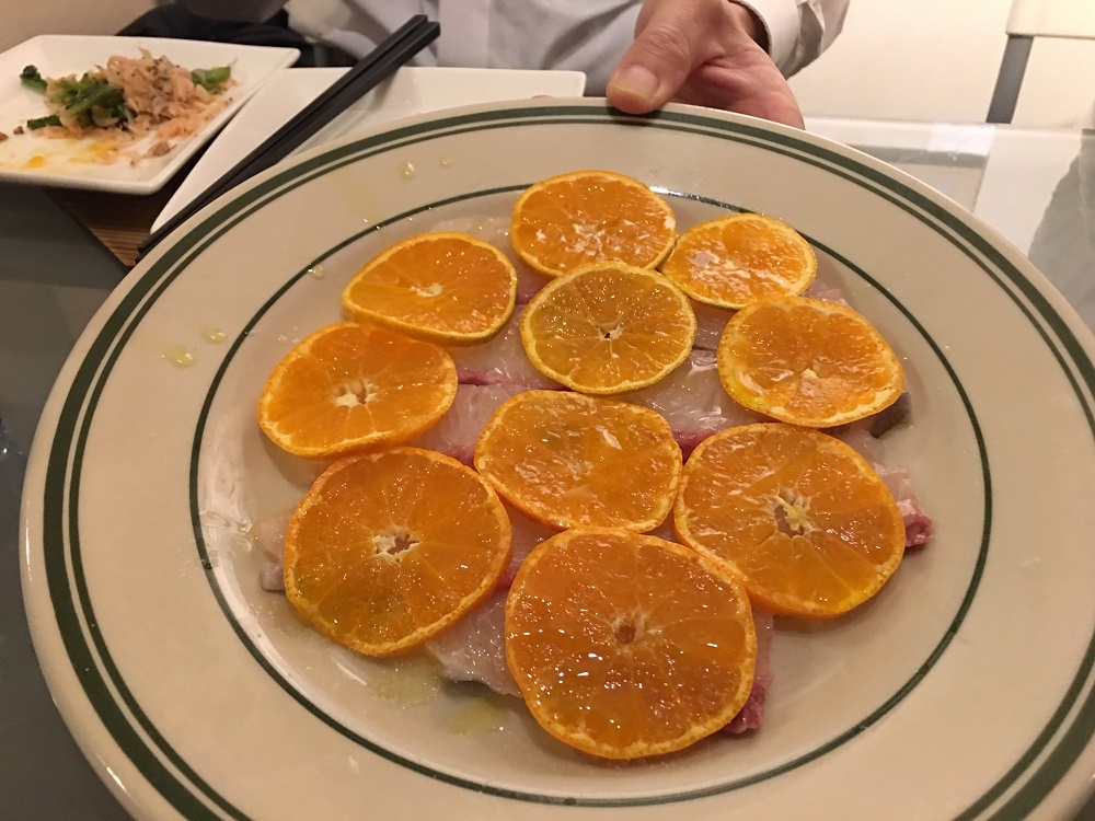 また一品出てきました、ぶりにオレンジを薄くスライスしたものが乗っています、ウーン、ぶりにオレンジという組み合わせは初めてです。 頂いてみると、アリです。旨いです。お酒に合います。