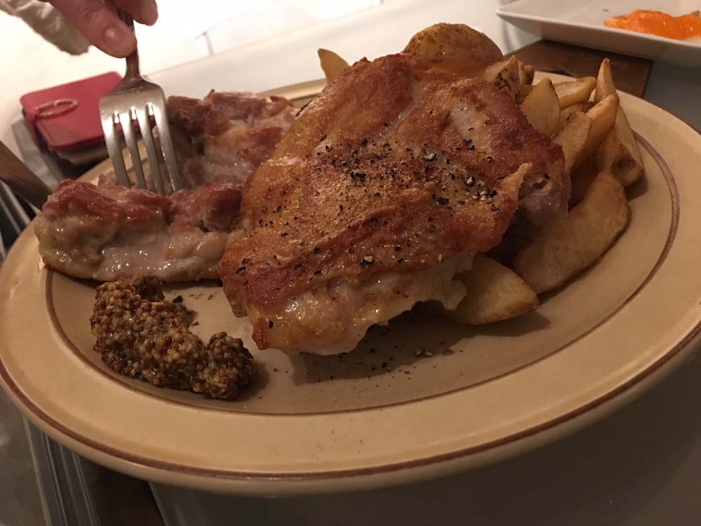 続いて、鶏肉のグリル、フライドポテトと粒マスタードが添えられて出てきました。 これが、赤ワインとよく合います。