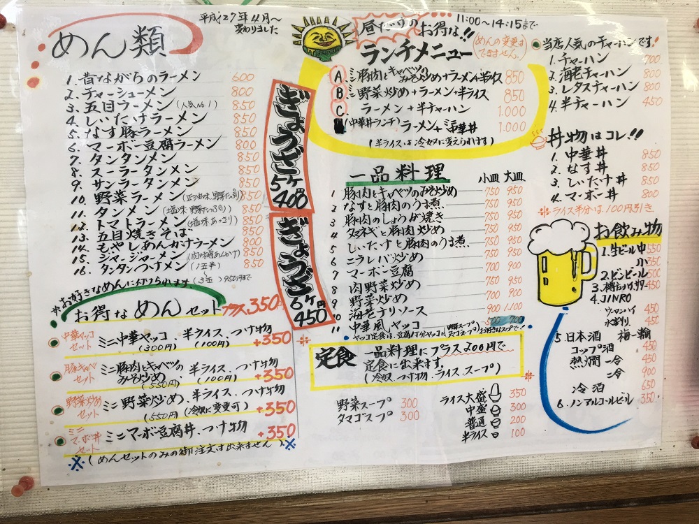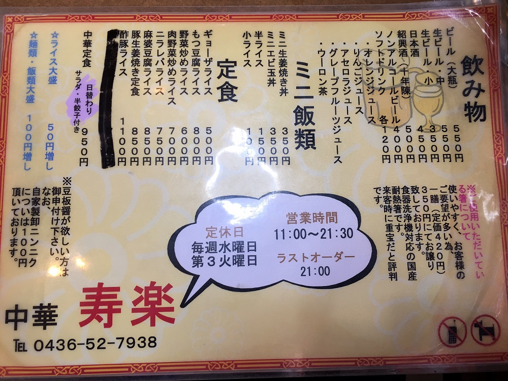 何を注文しても満足のいく、美味しい料理なのですが。裏メニューの味噌味チャーハン(今は裏メニューとして貼り出しています。^_^)や スープにとろみがあり、なかなか冷めないので猫舌の方にはお勧めできませんが、ボリュームとうま味のある店の名前を冠する「寿楽メン」もお勧めです。