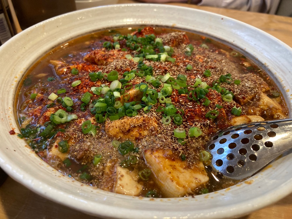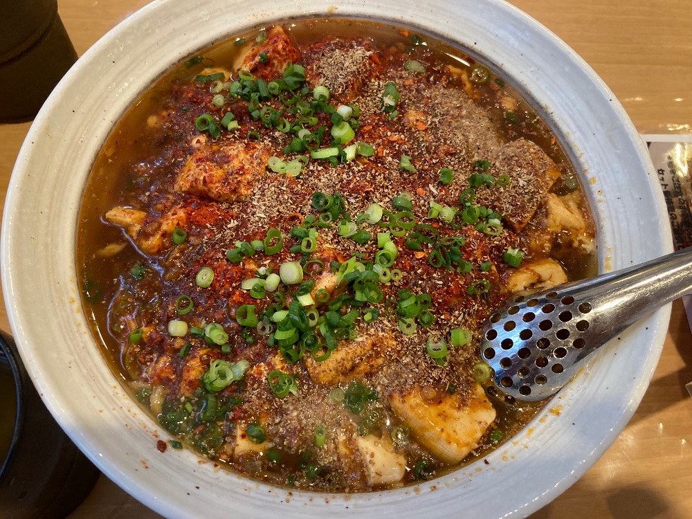麻婆麺は赤唐辛子と山椒がふんだんにかけられ辛さのパンチ力はかなりのもの!そして、辛さの後にうま味が口の中に広がり、汗が噴出します。