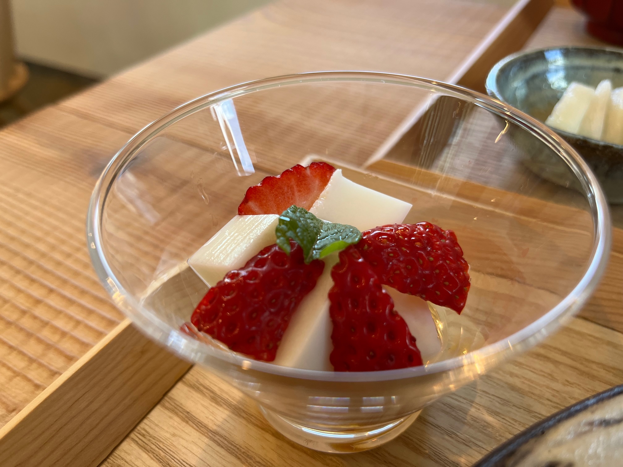 デザートは手作りの杏仁豆腐、飾られた苺も甘くて美味しい(2023.4)