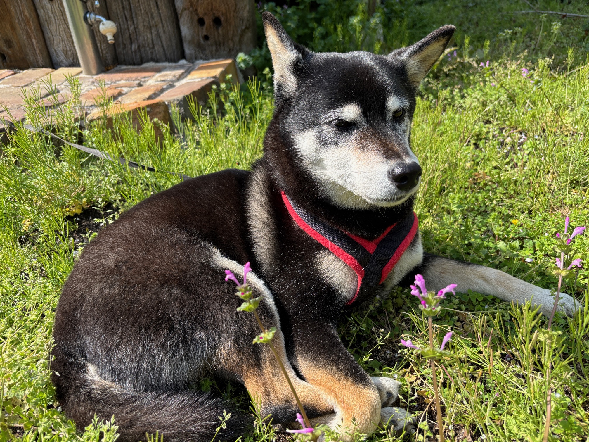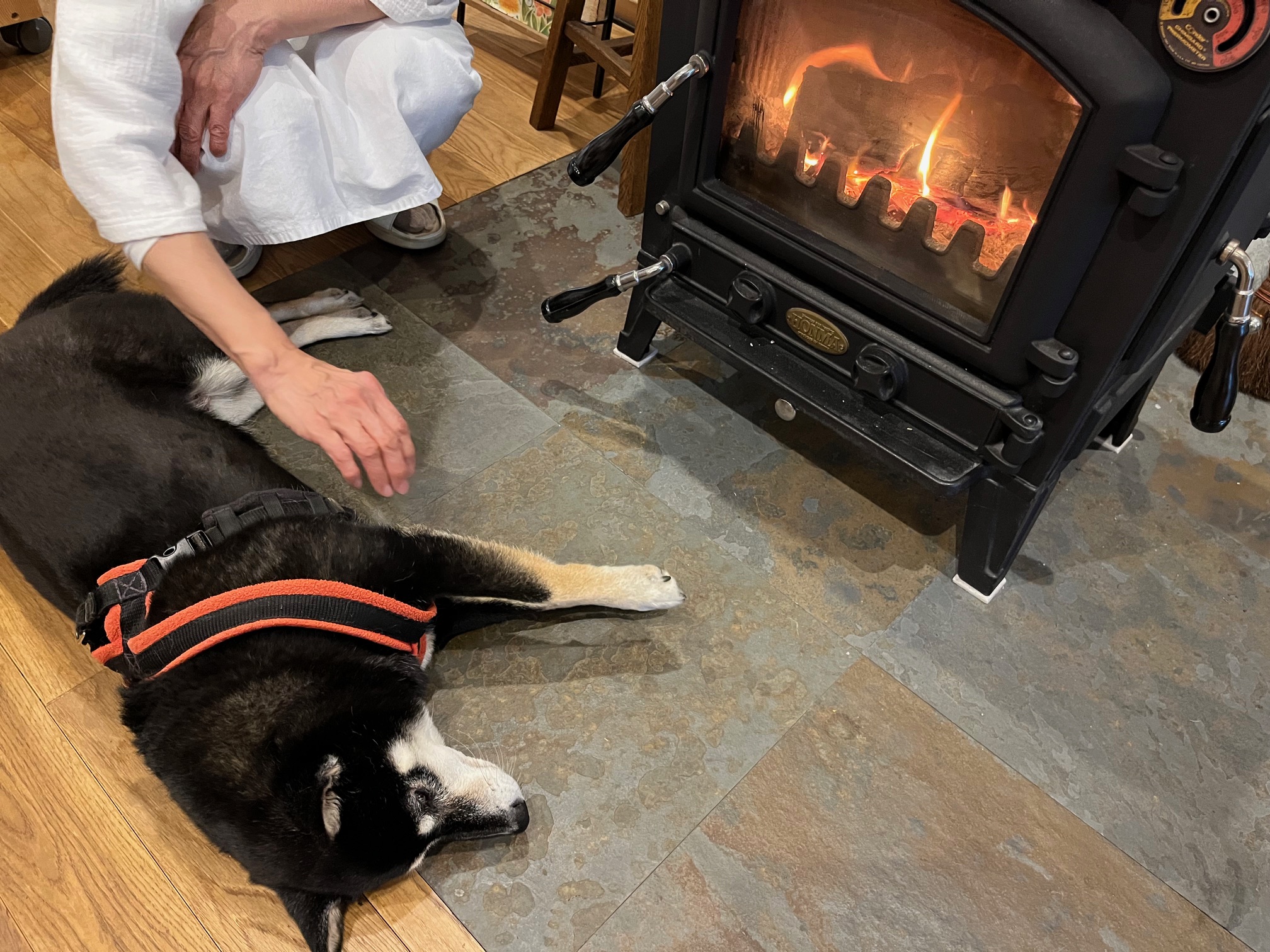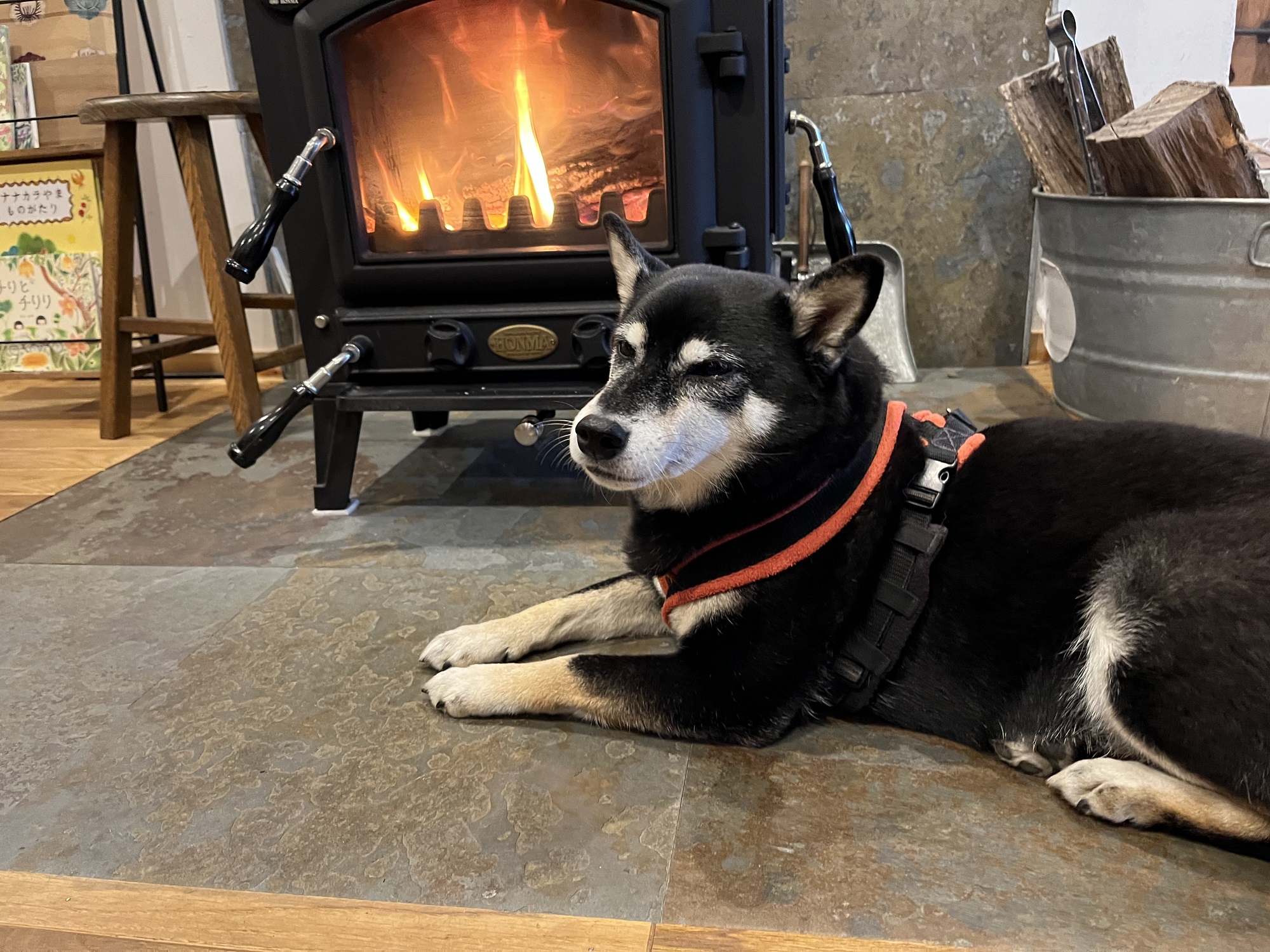 お店の看板犬、柴犬のみくちゃんは薪ストーブの前がお気に入りのようです(2023.11)