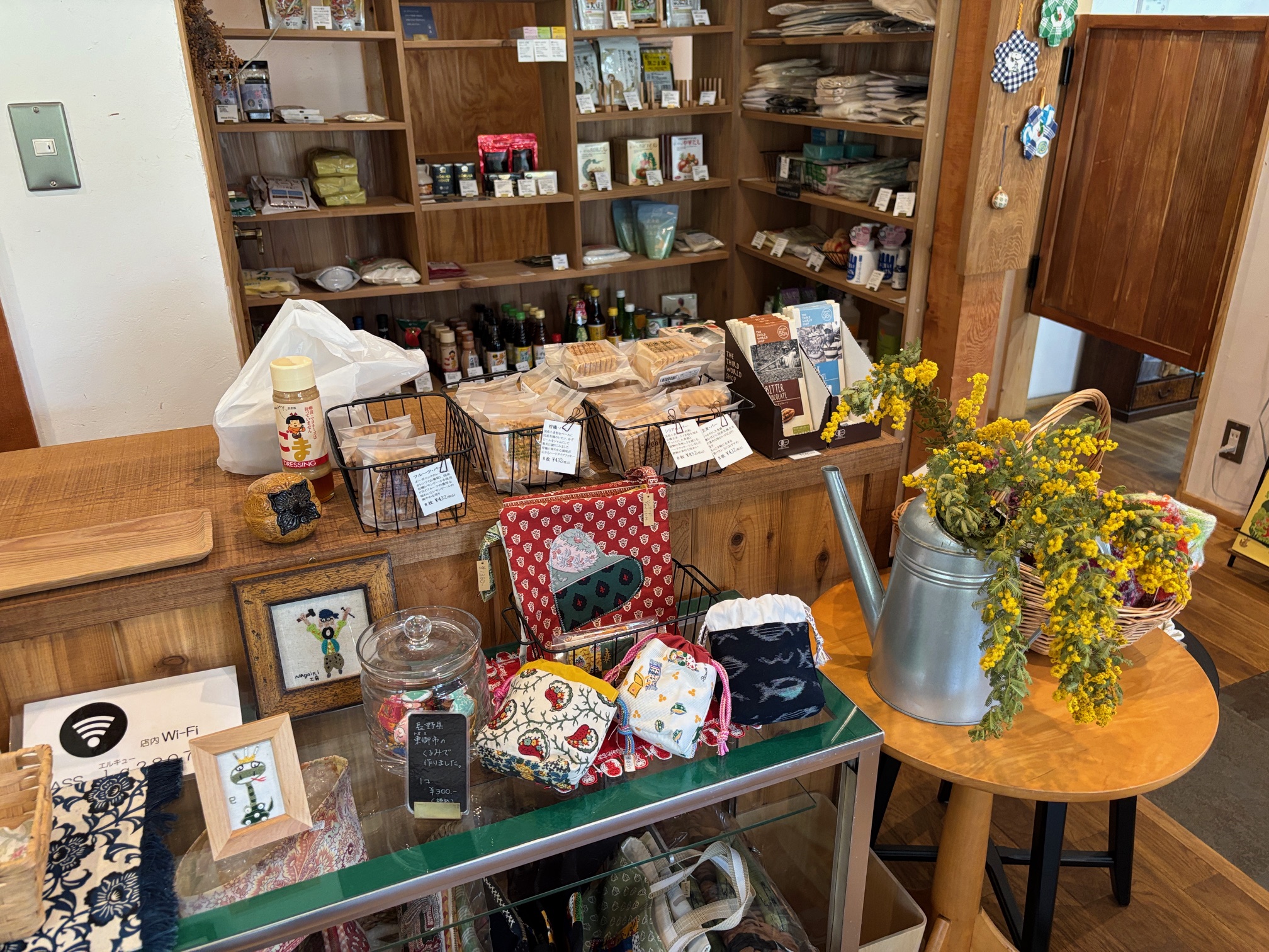雑貨の展示の脇に菜の花が添えられています(2025.03)