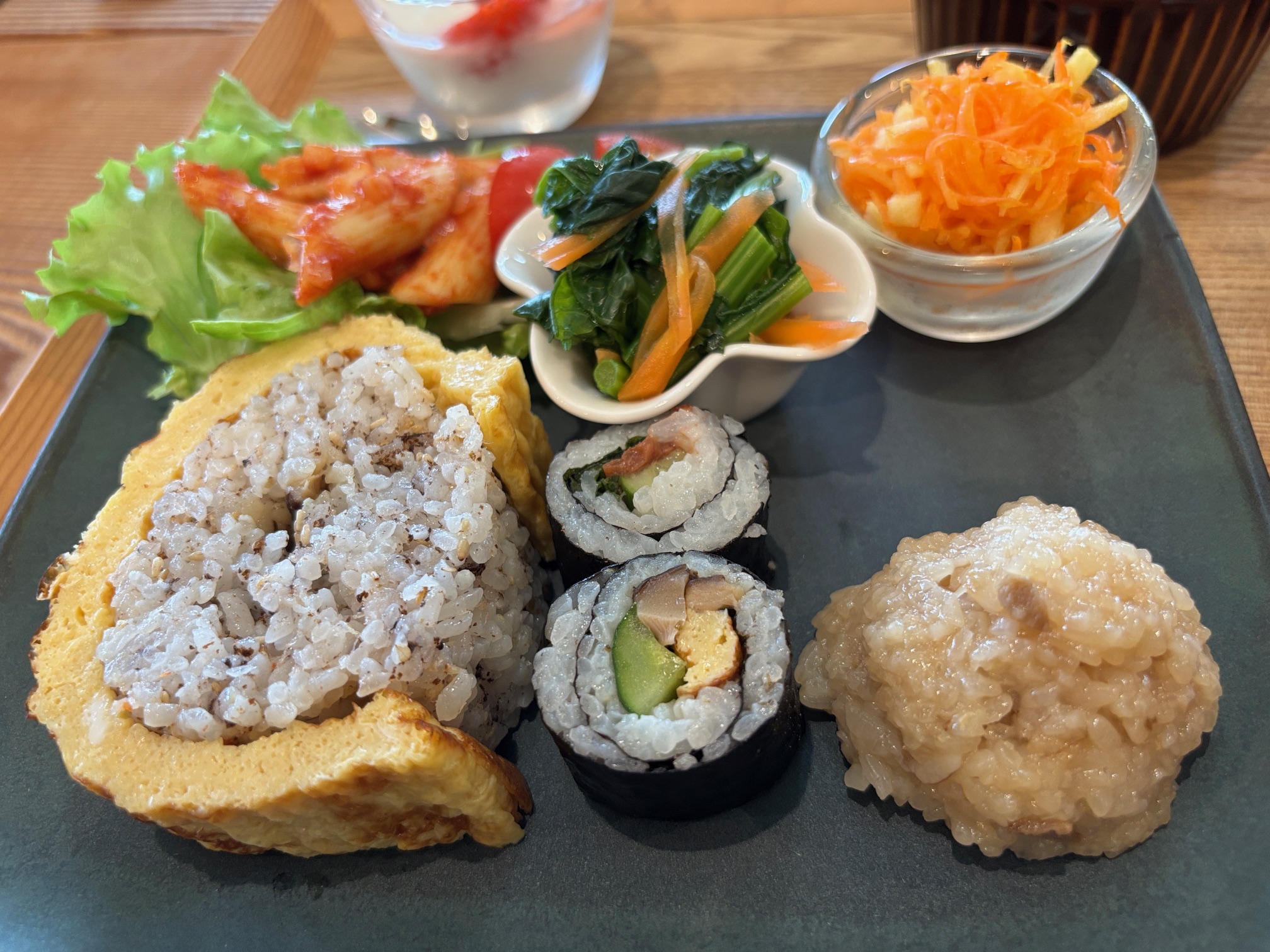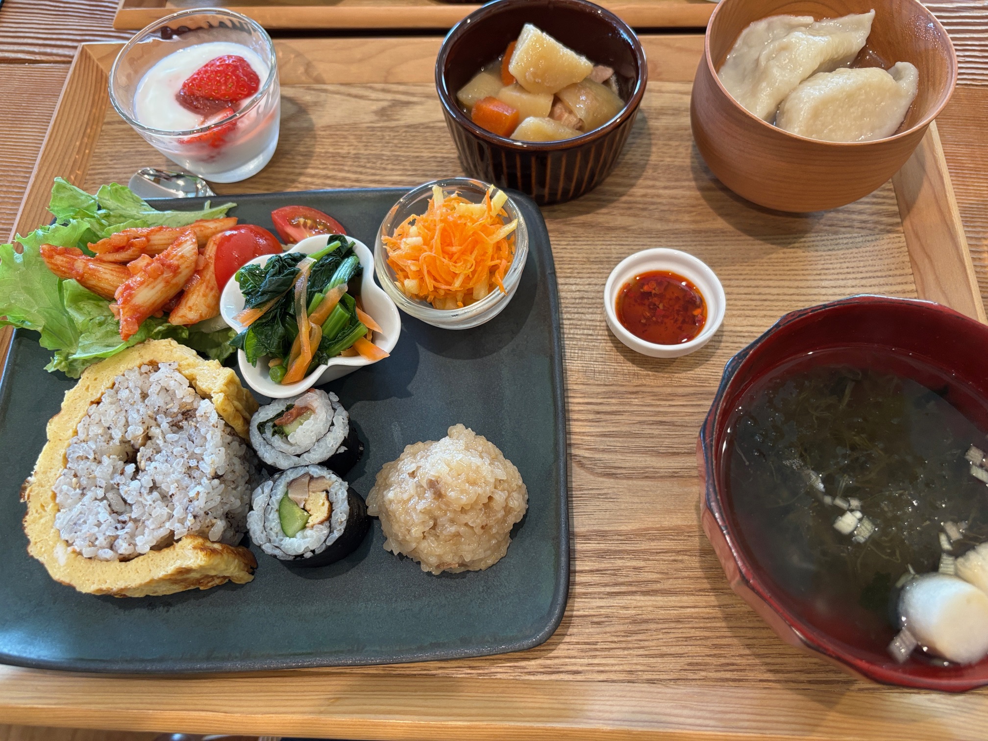 本日のランチは、卵巻き寿司・水餃子・肉じゃが・菜の花とキャベツ・人参おひたし・人参とリンゴのサラダ・お吸い物・トマトペンネ・ミニデザート