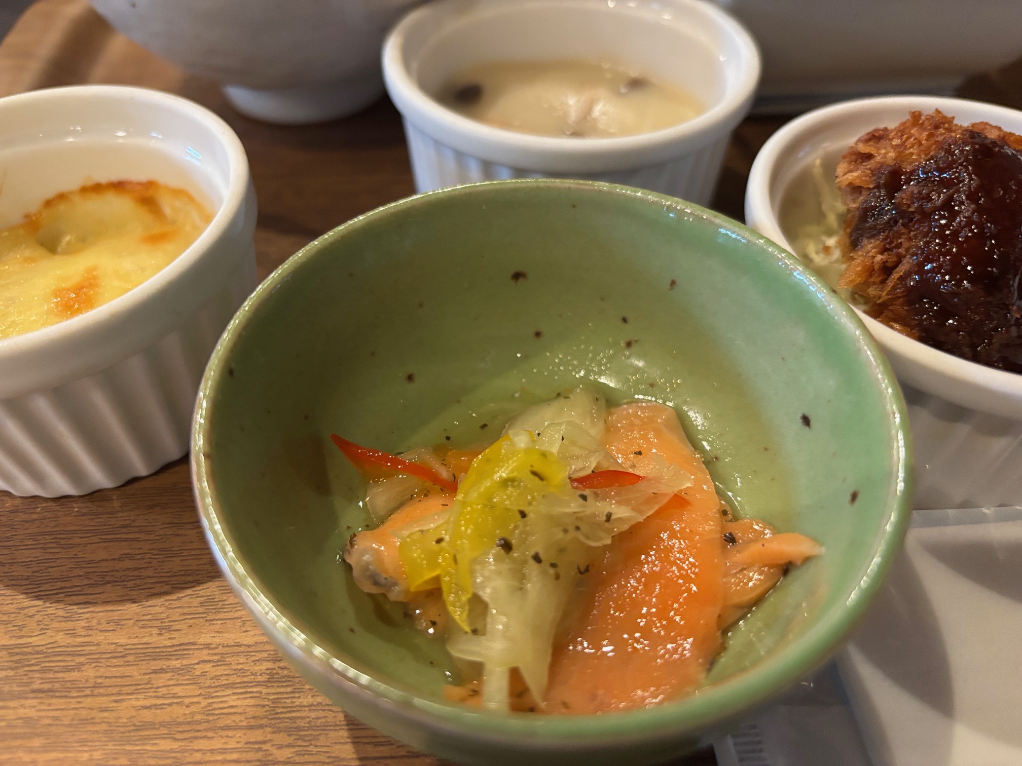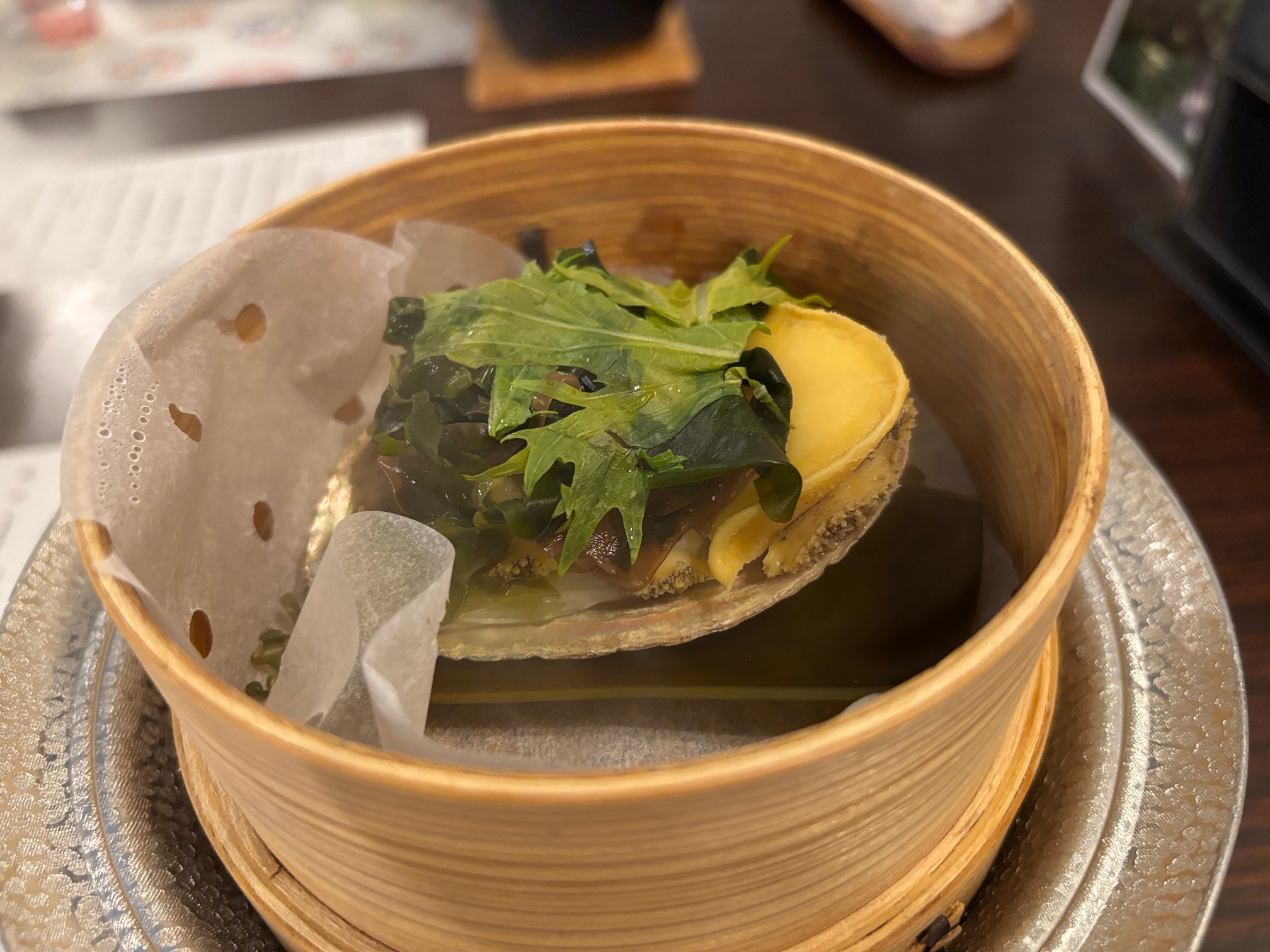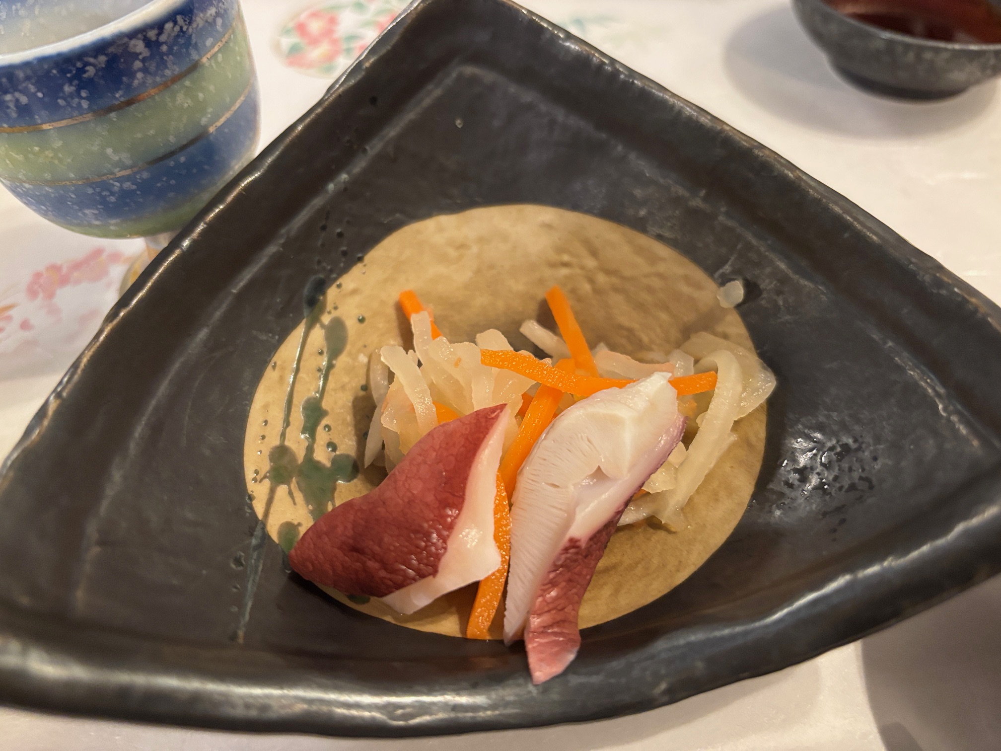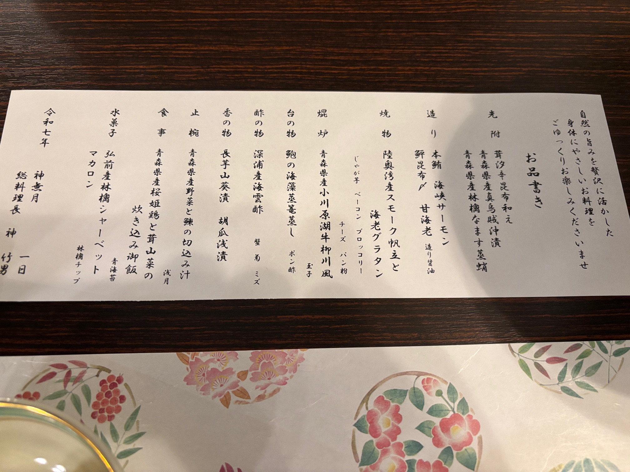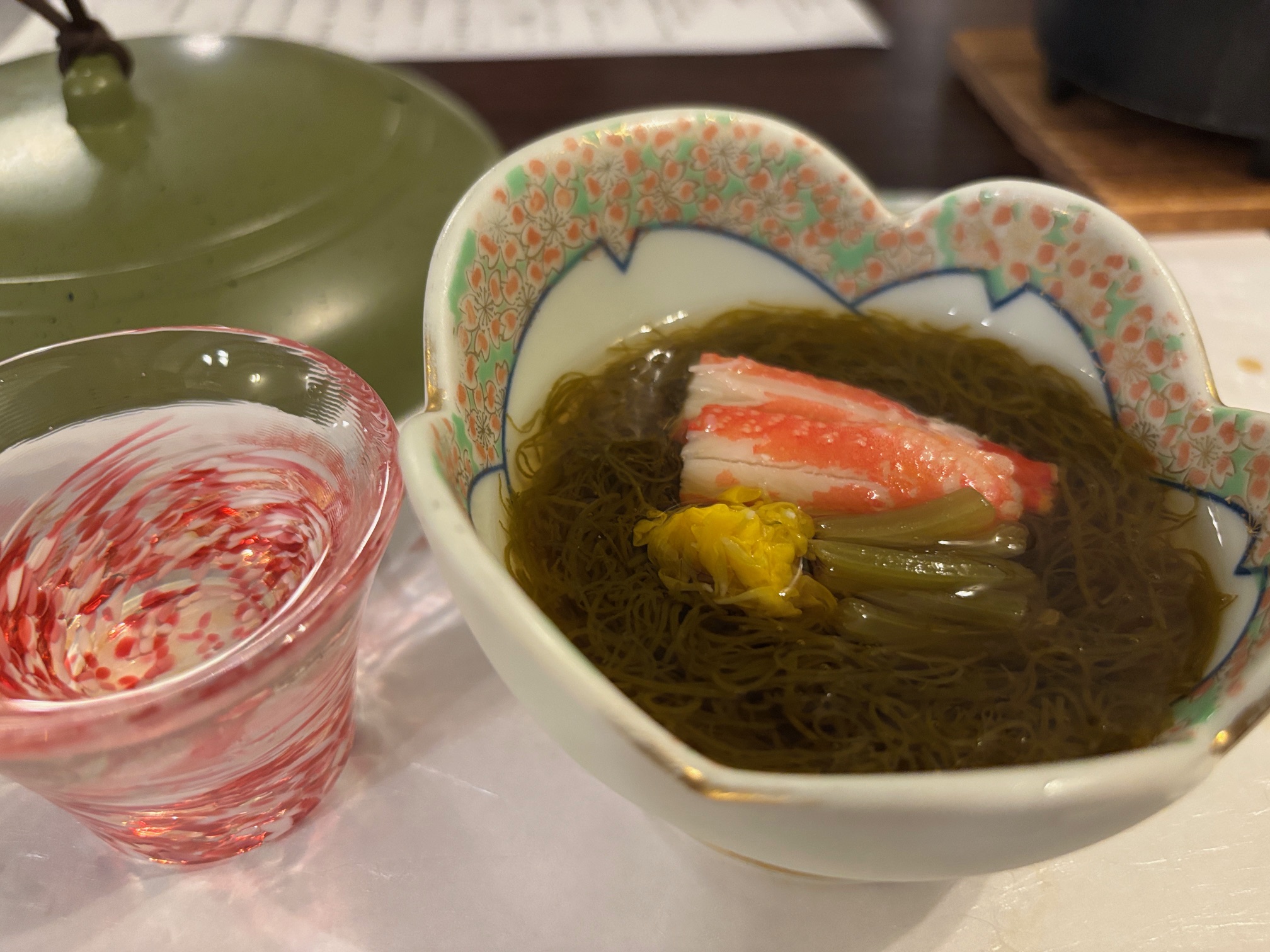 ◆先附・・茸汐幸昆布和え、青森県産真烏賊沖漬、青森県林檎なます蒸蛸