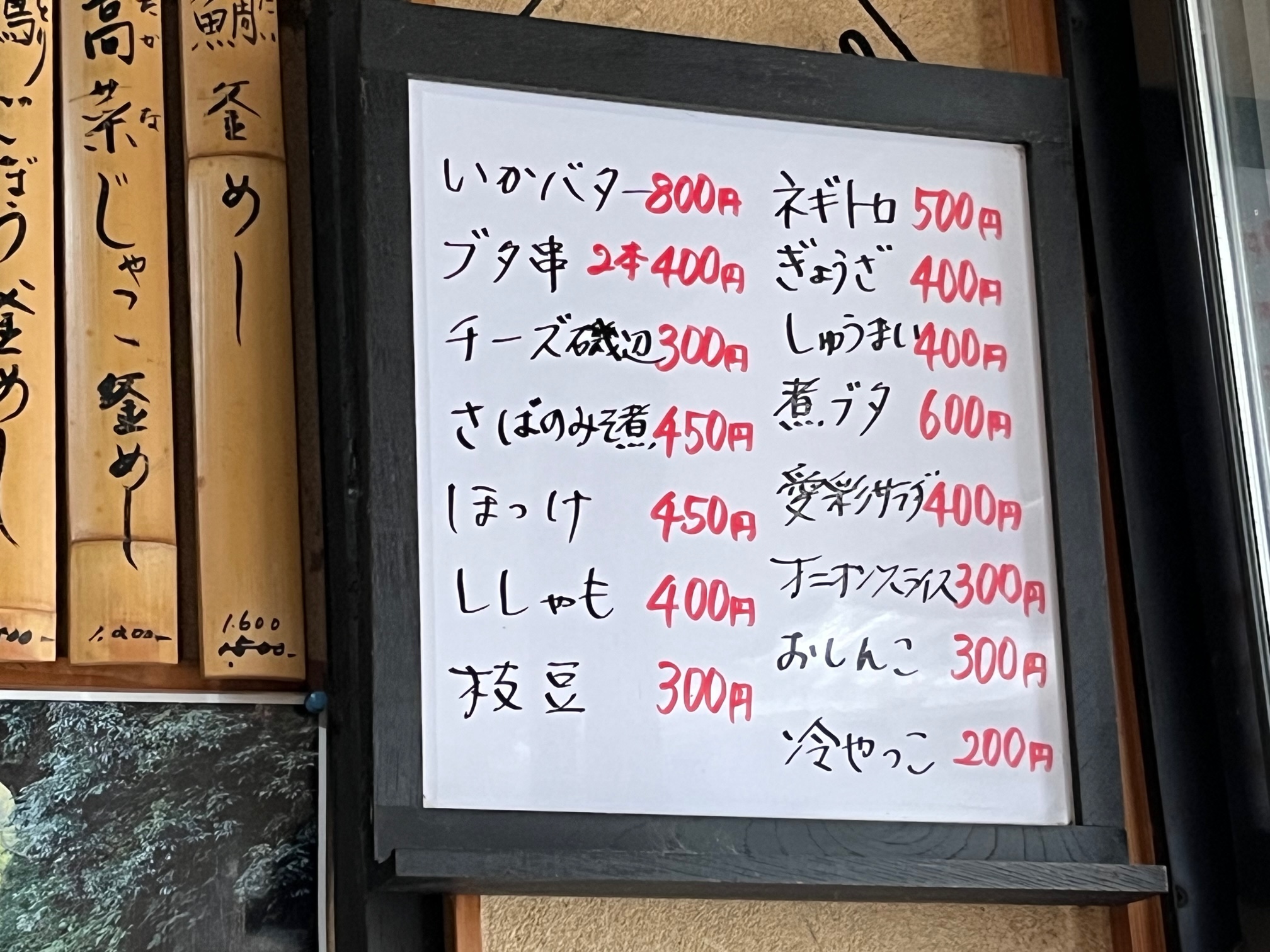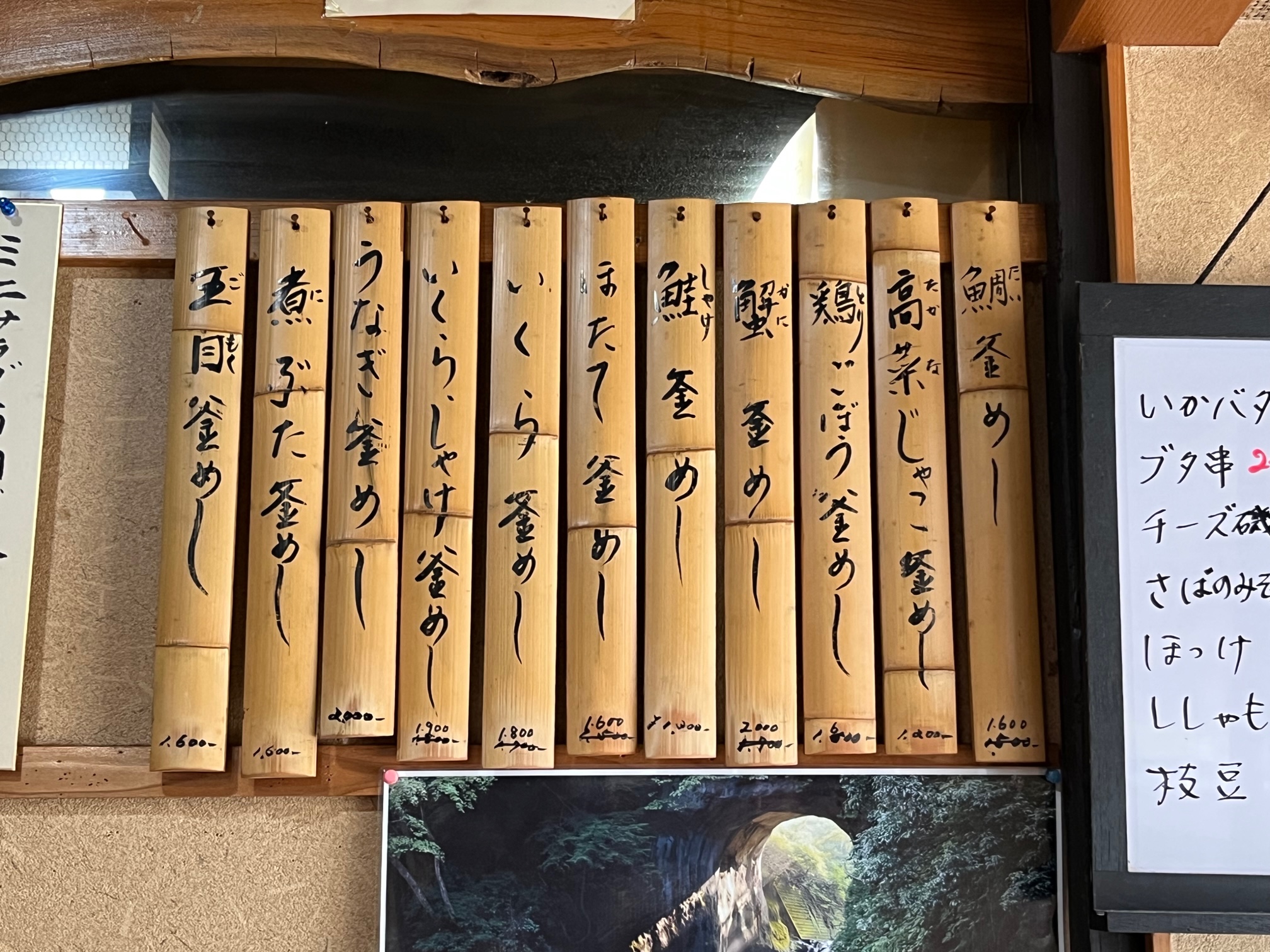 釜めしのメニューは全11種類、鯛1600円、高菜じゃこ1200円、鶏ごぼう1600円、蟹2000円、鮭1300円、ほたて1600円、いくら1800円、いくらしゃけ1900円、うなぎ2000円、煮ぶた1600円、五目1600円(2023.5)