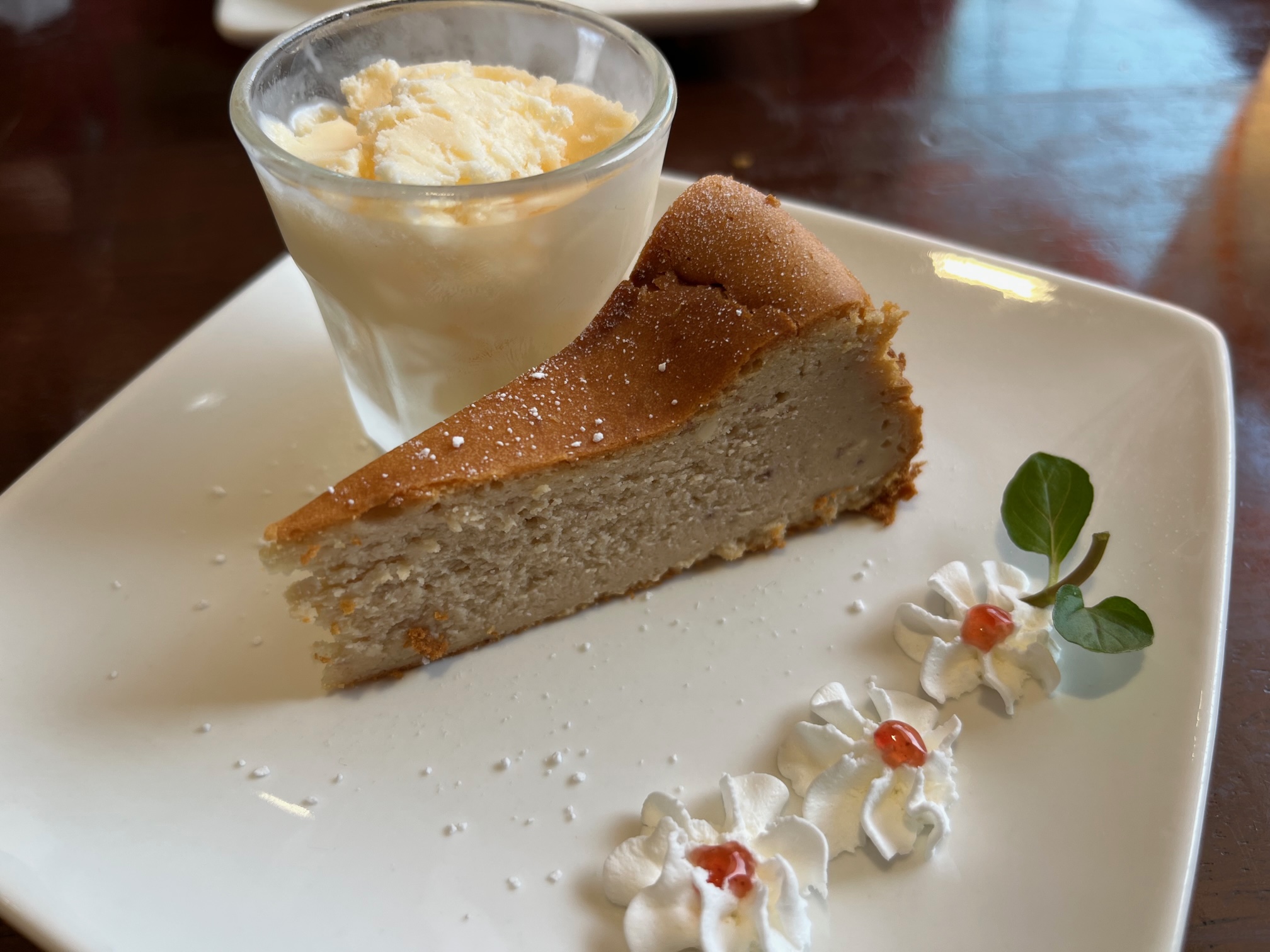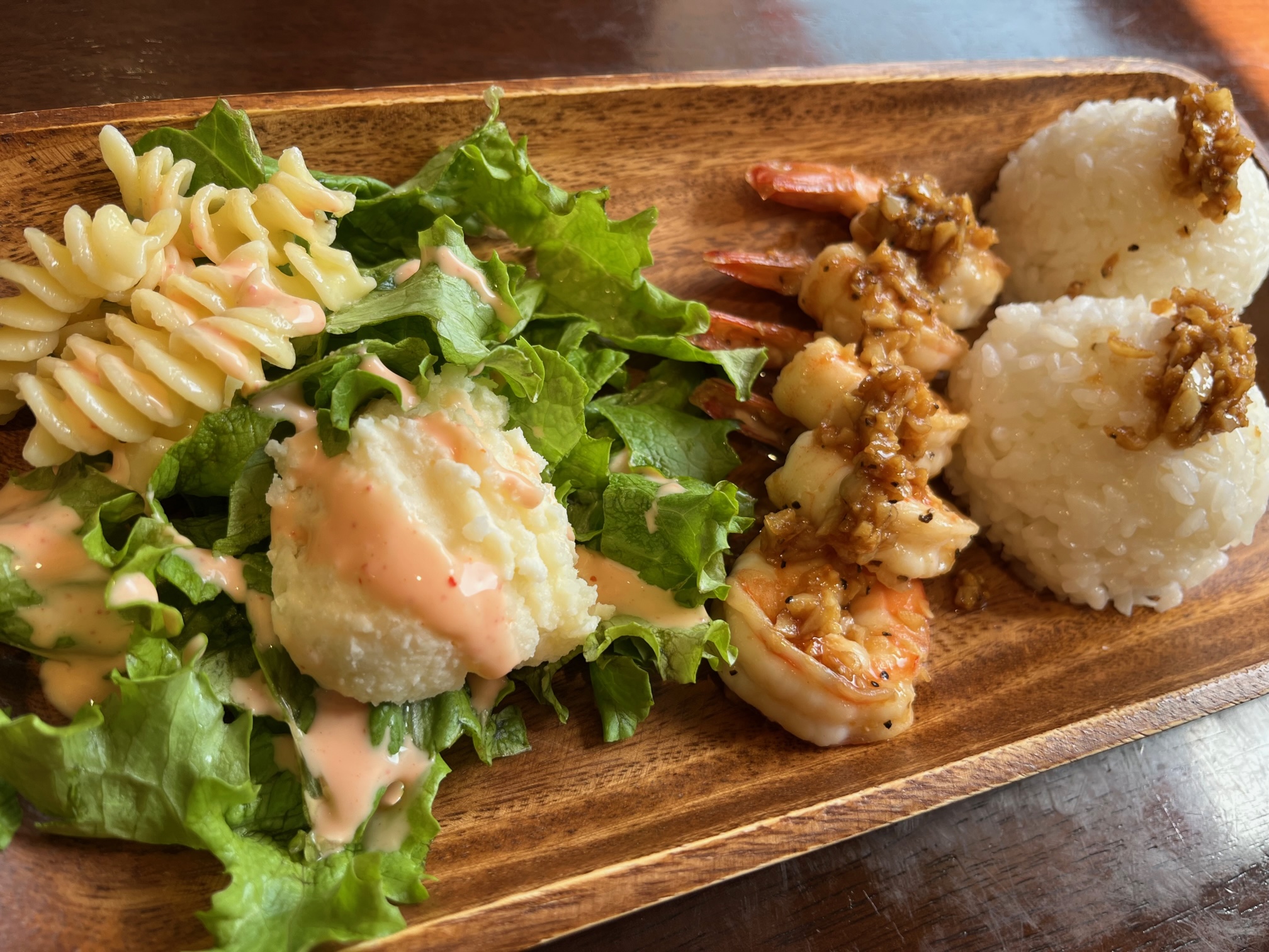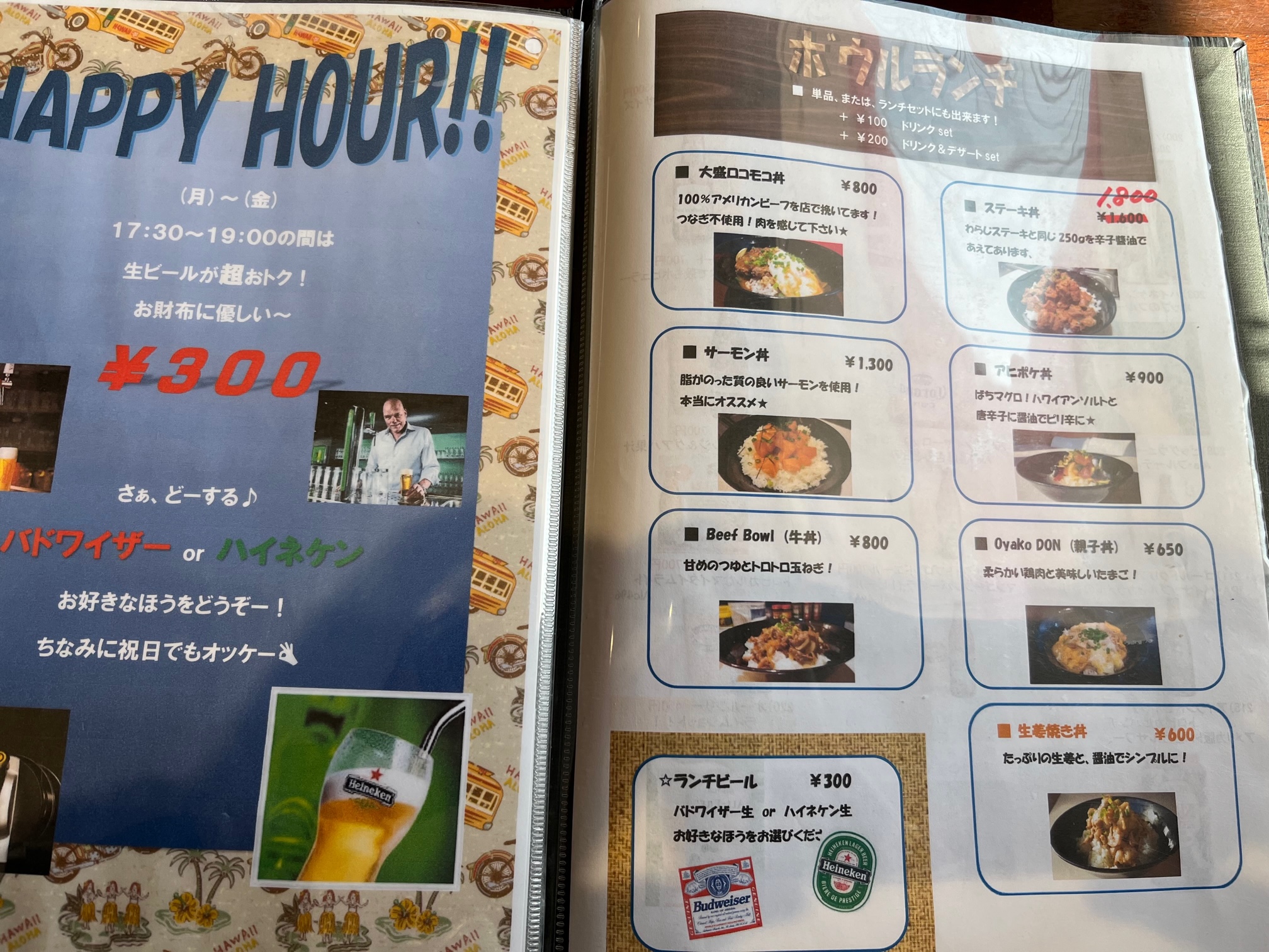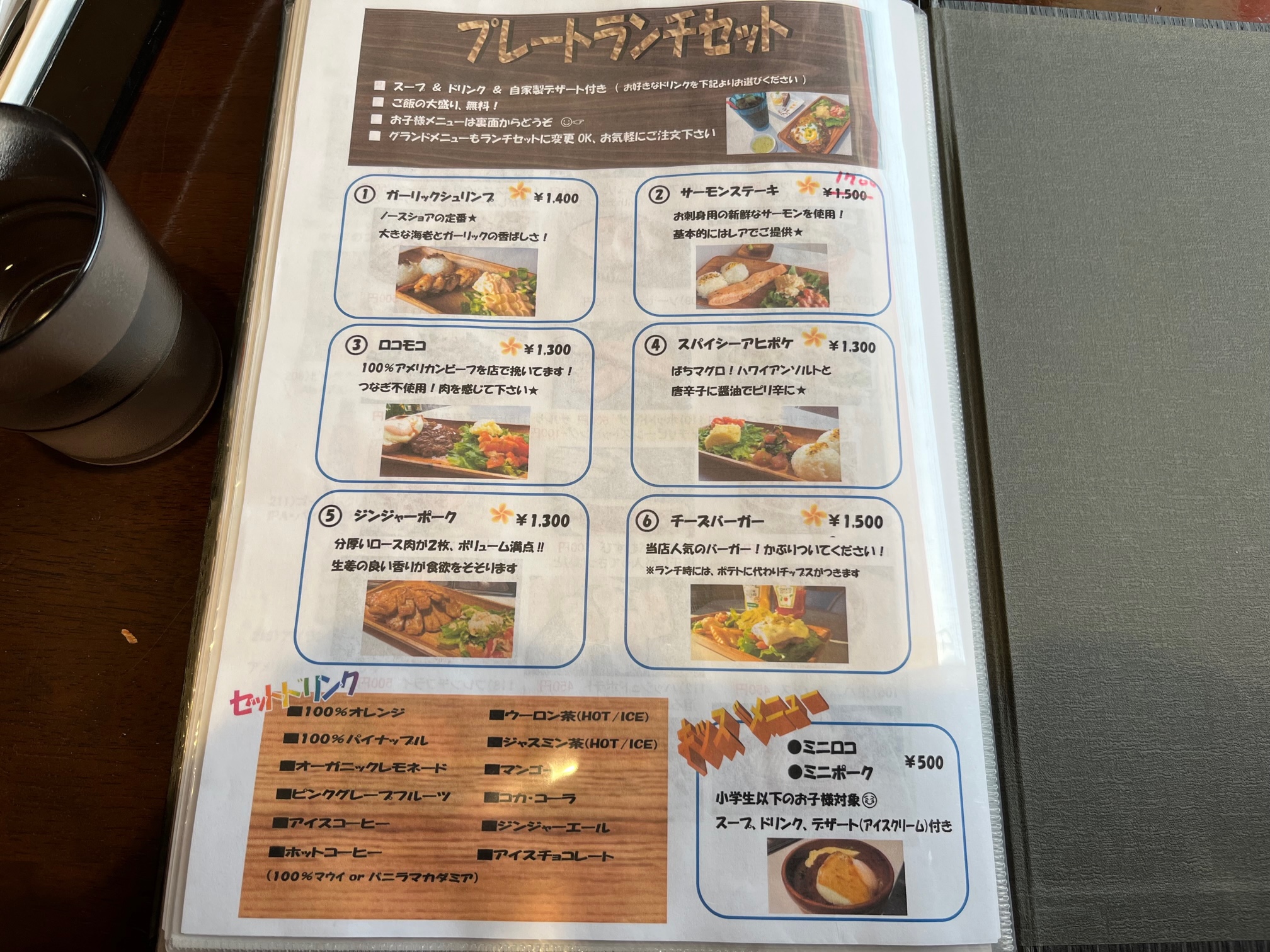 ランチプレートセットのガーリックシュリンプ1400円とロコモコ1300円を+200円でドリンク&デザートセットでオーダー、良心的なセット価格です(2023.3)