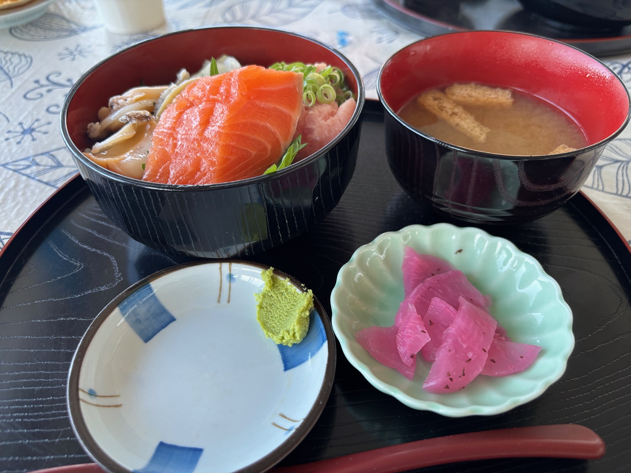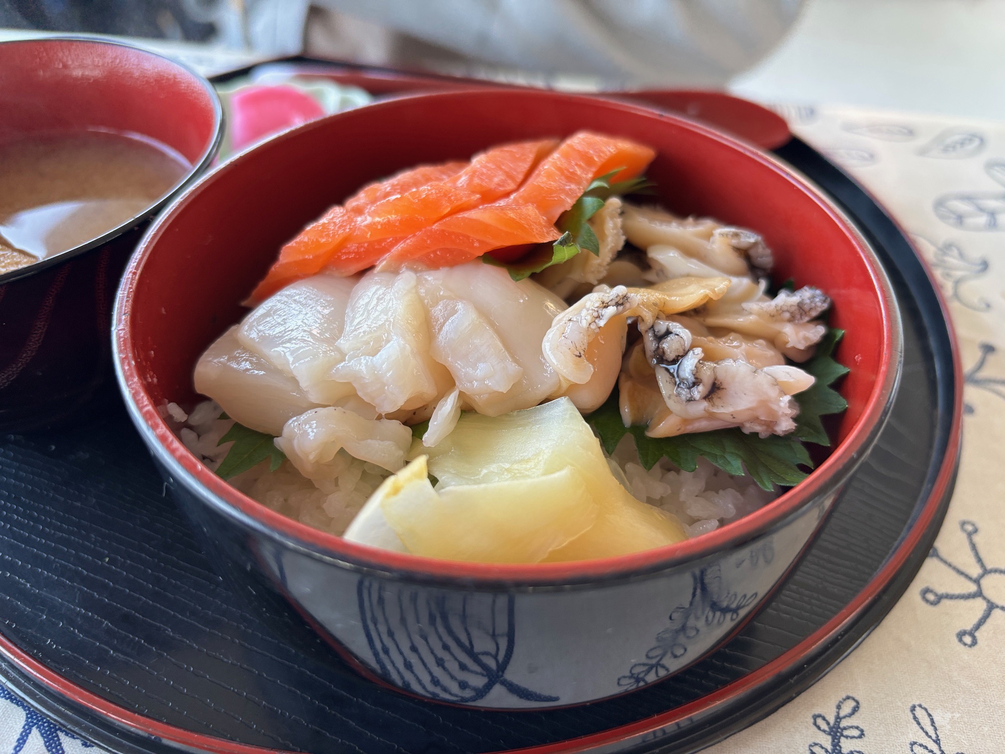 奥さんが頼んだあわび・ほたて・サーモンの三色丼ミニ、こちらも美味しそう(2025.10)