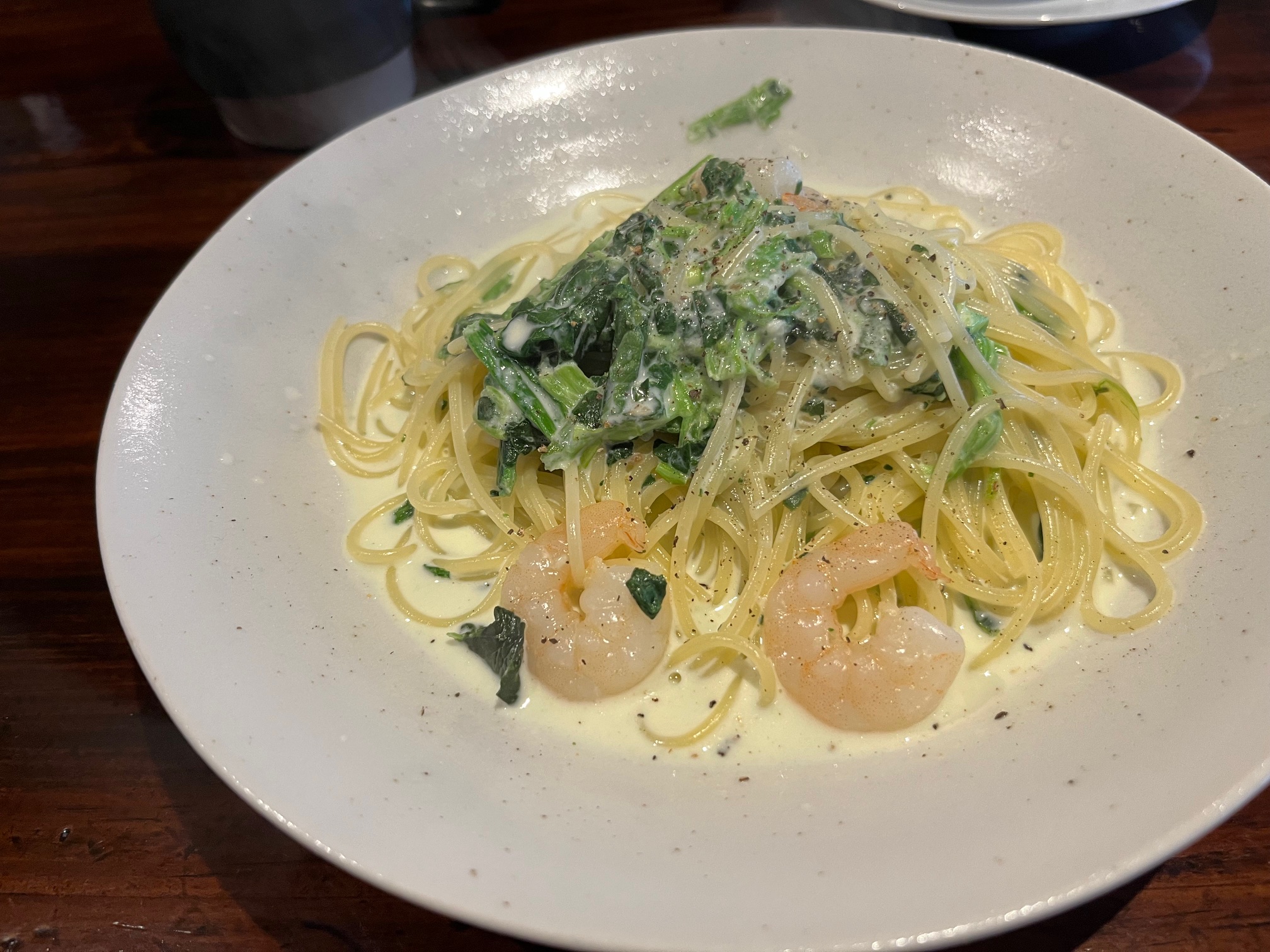 エビとほうれん草のクリームパスタをランチセットでオーダーしました。(2023.12)