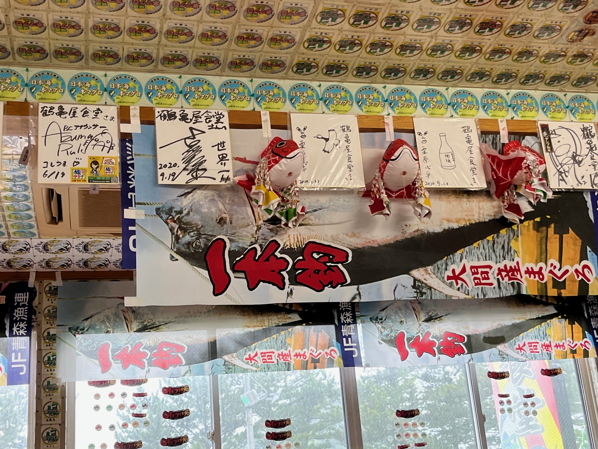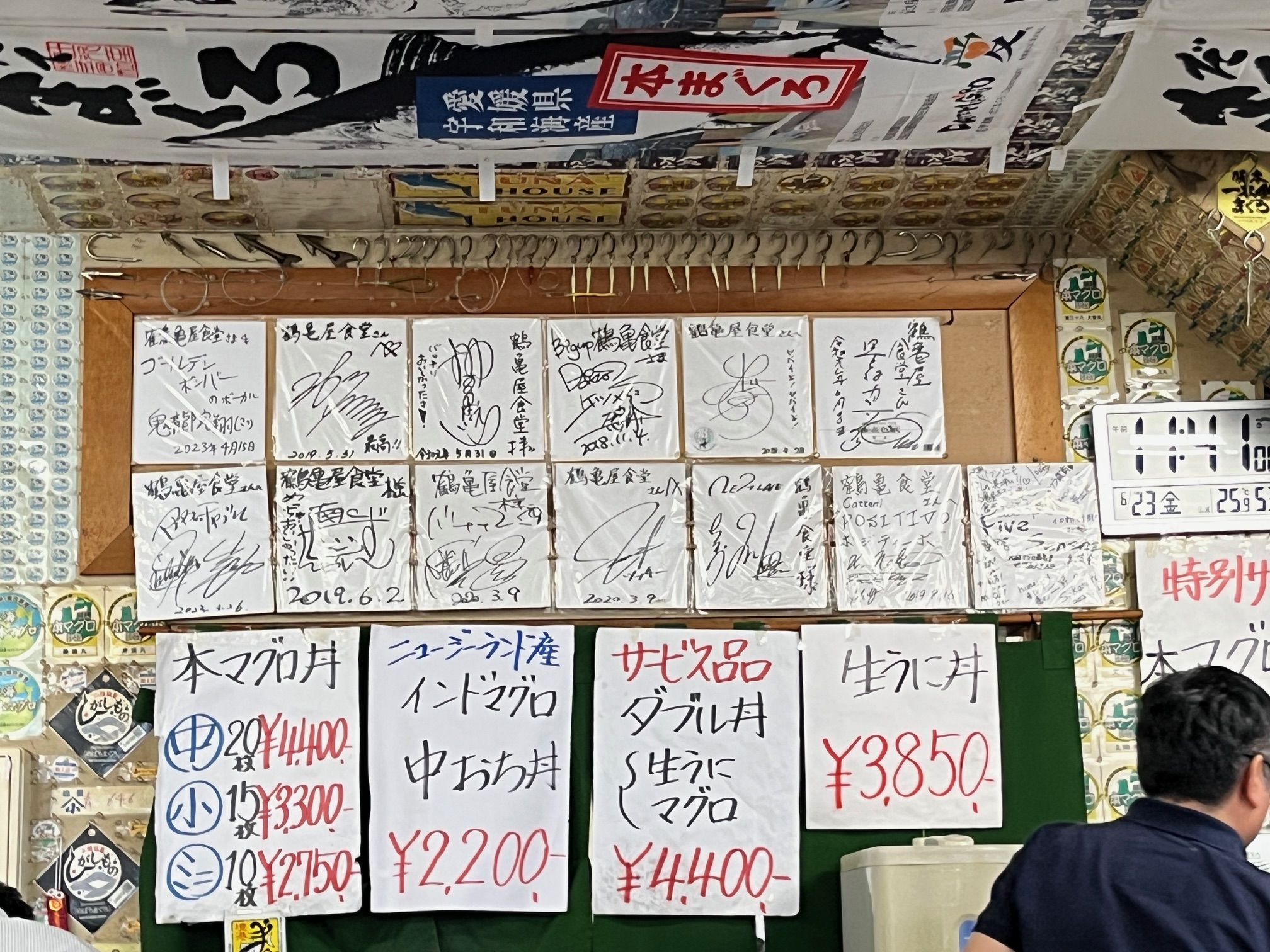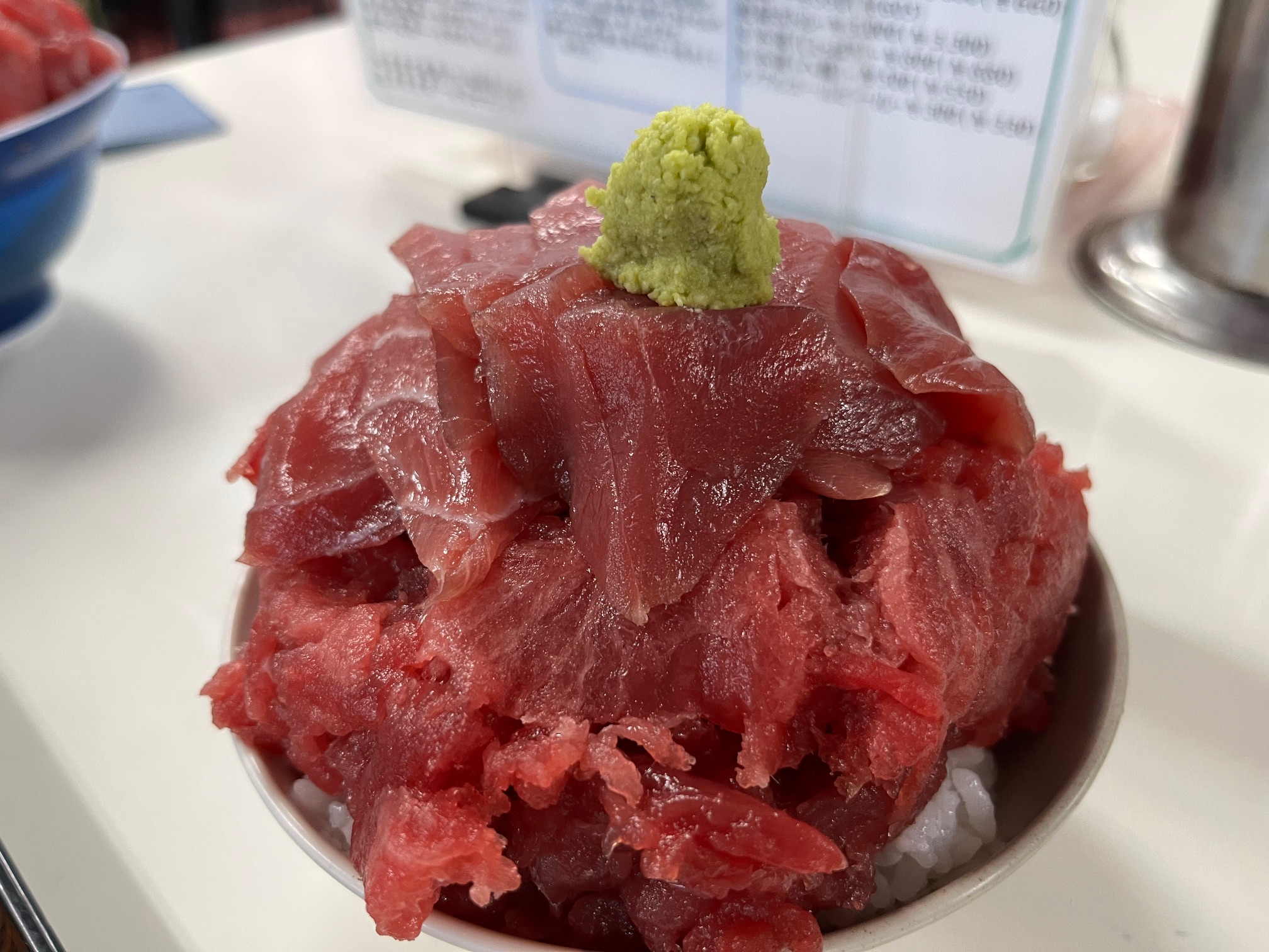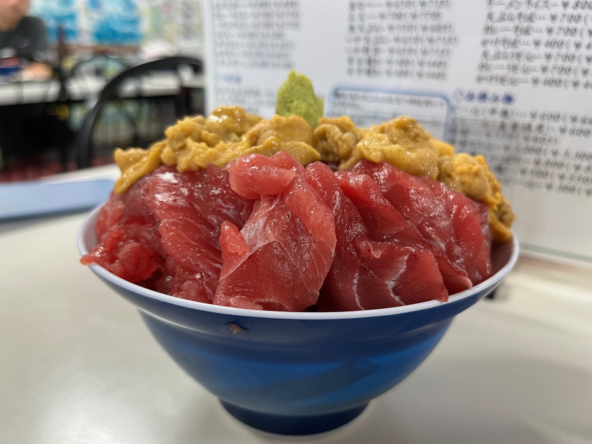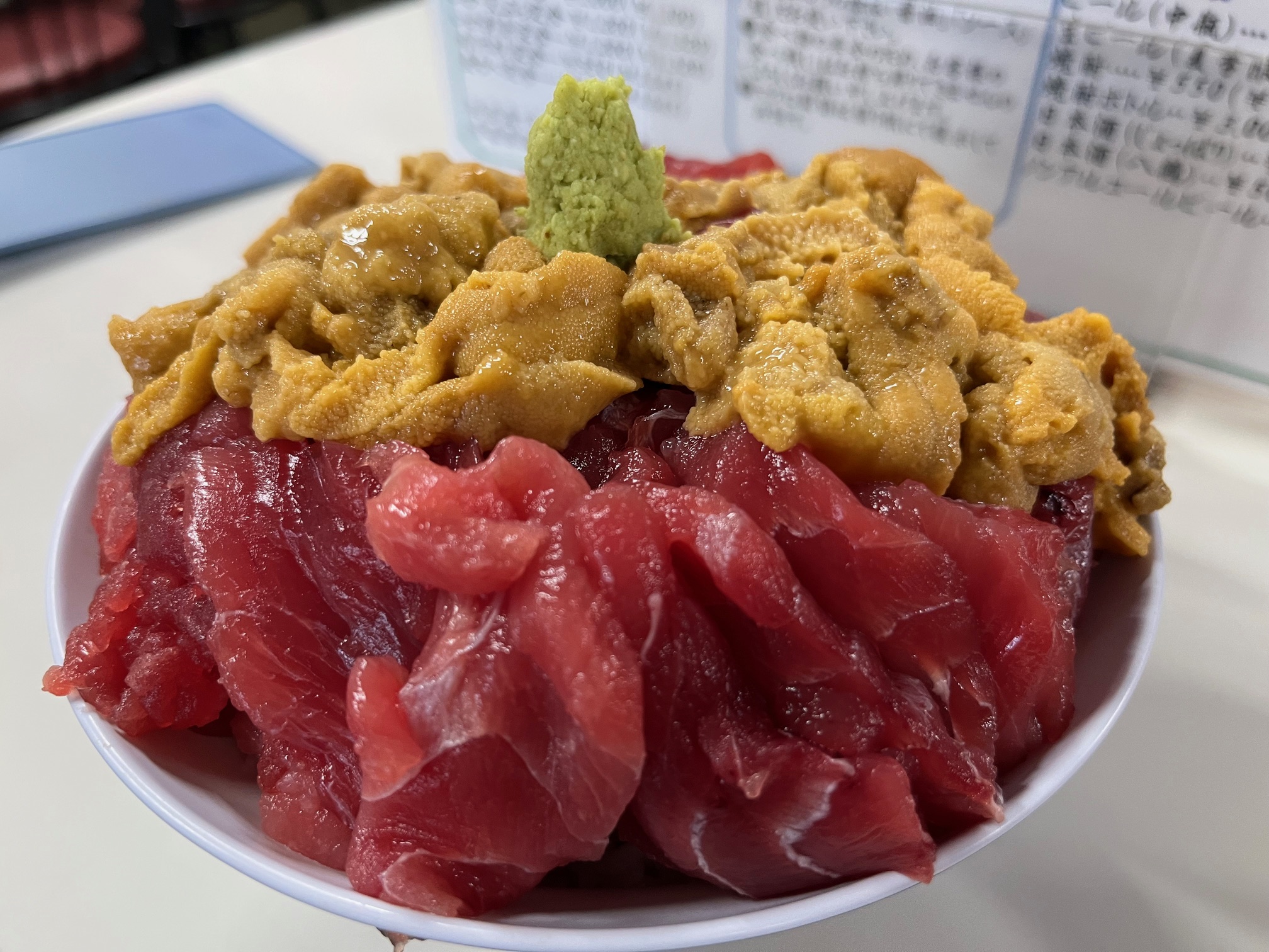 30分ほど待って席に案内されました。本マグロ丼は中4400円、小3300円、ミニ2750円、サービス品ダブル丼(生うに、マグロ)4400など、かなりのボリュームがあることを事前に調べていたので私は本マグロ丼小、奥さんはダブル丼をオーダー