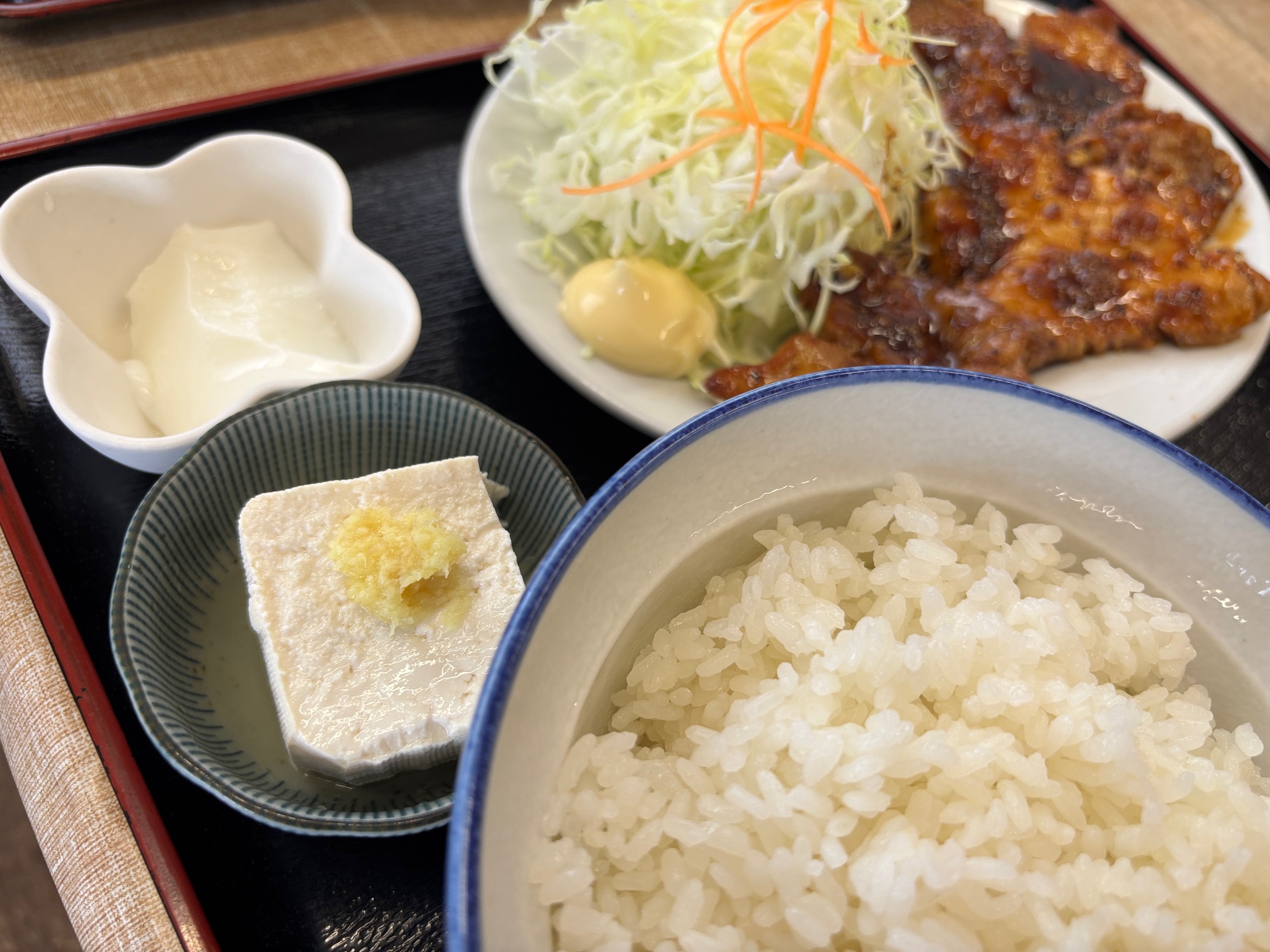 どんぶりご飯、お味噌汁、お新香、豆腐、杏仁がついてます
