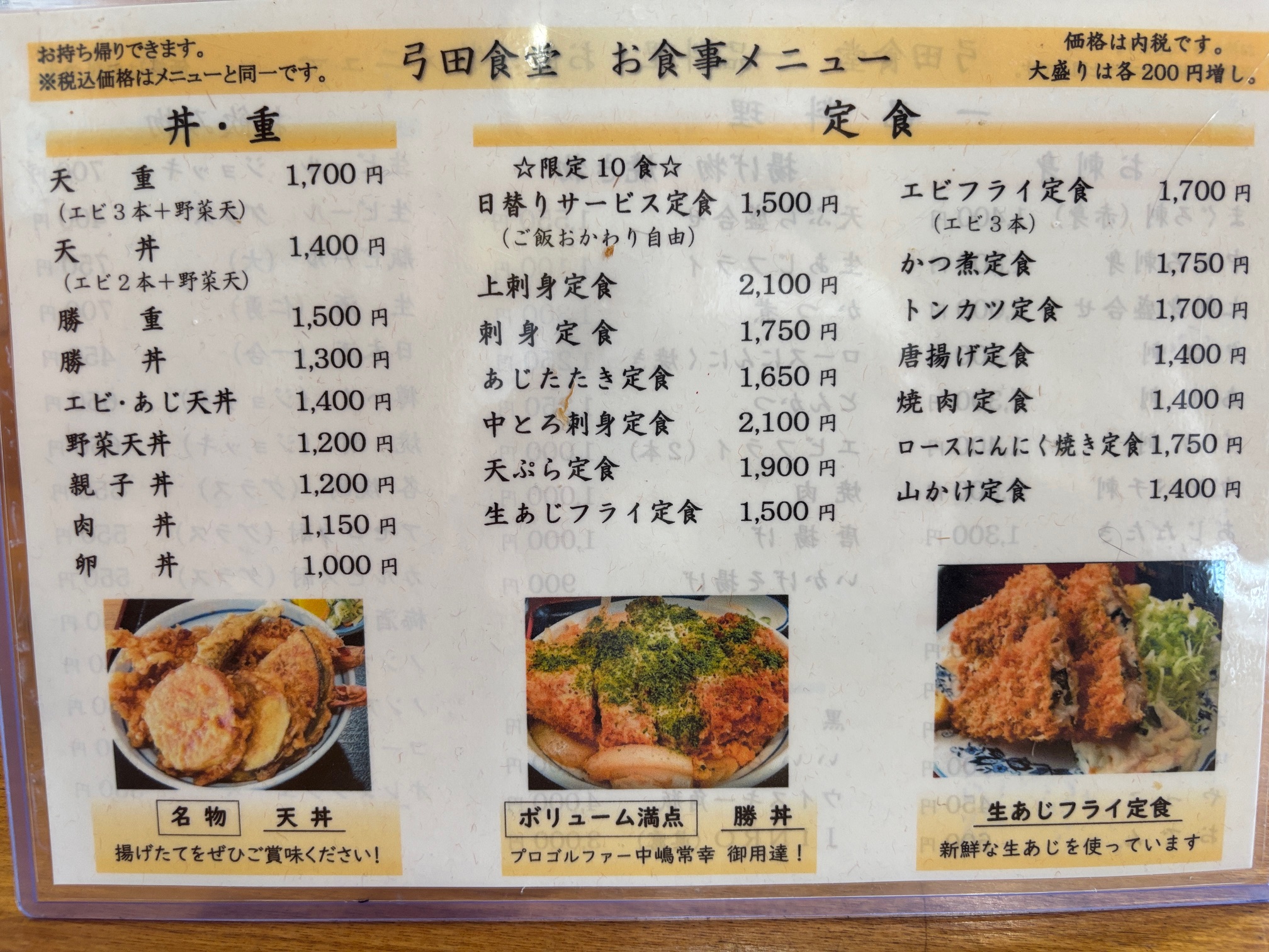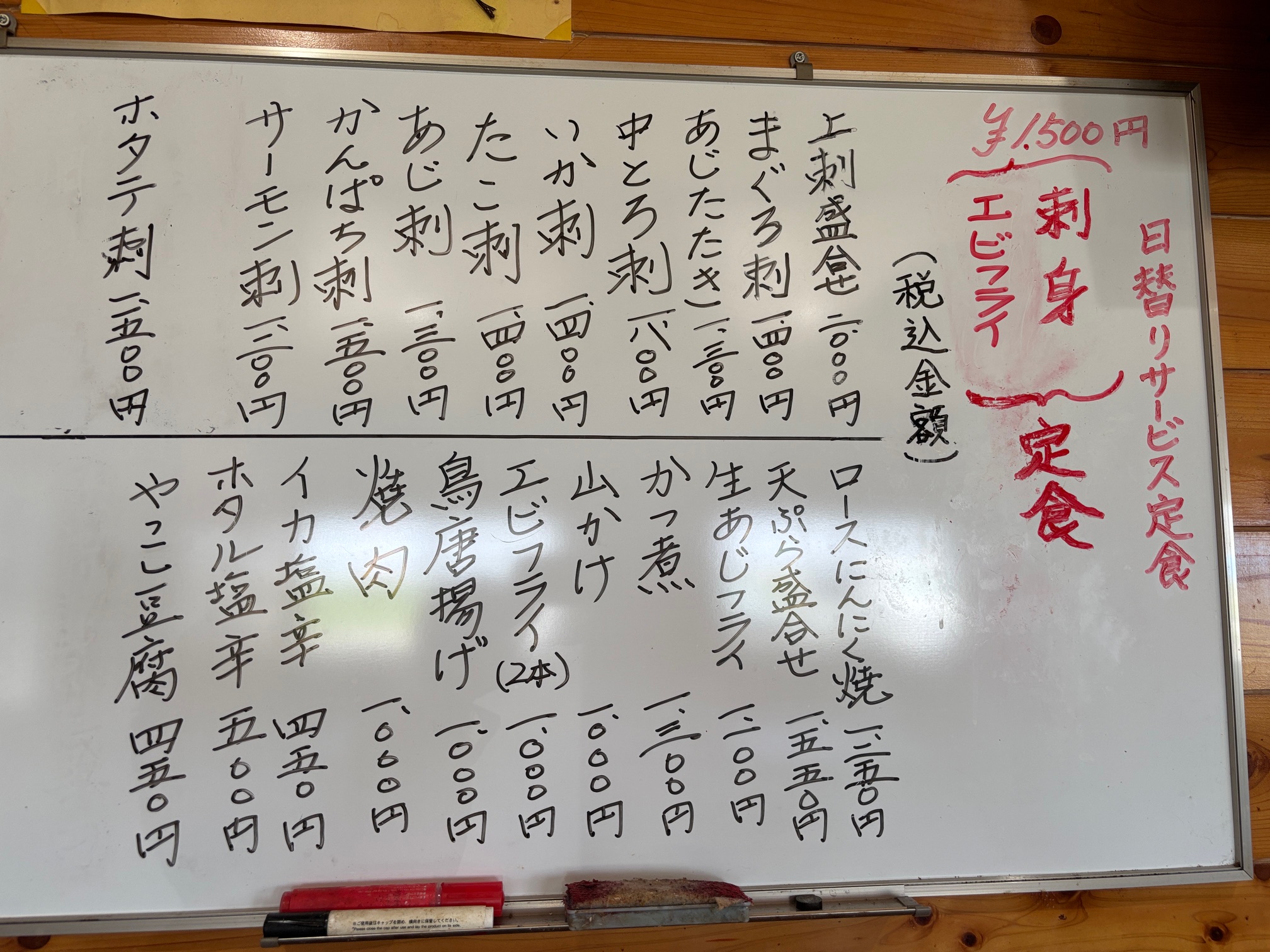 ロースにんにく焼、天ぷら盛合わせ、生あじフライ、かつ煮、山かけ、エビフライ、鶏唐揚げ、焼肉、イカ塩辛、ホタル塩辛、やっこ豆腐